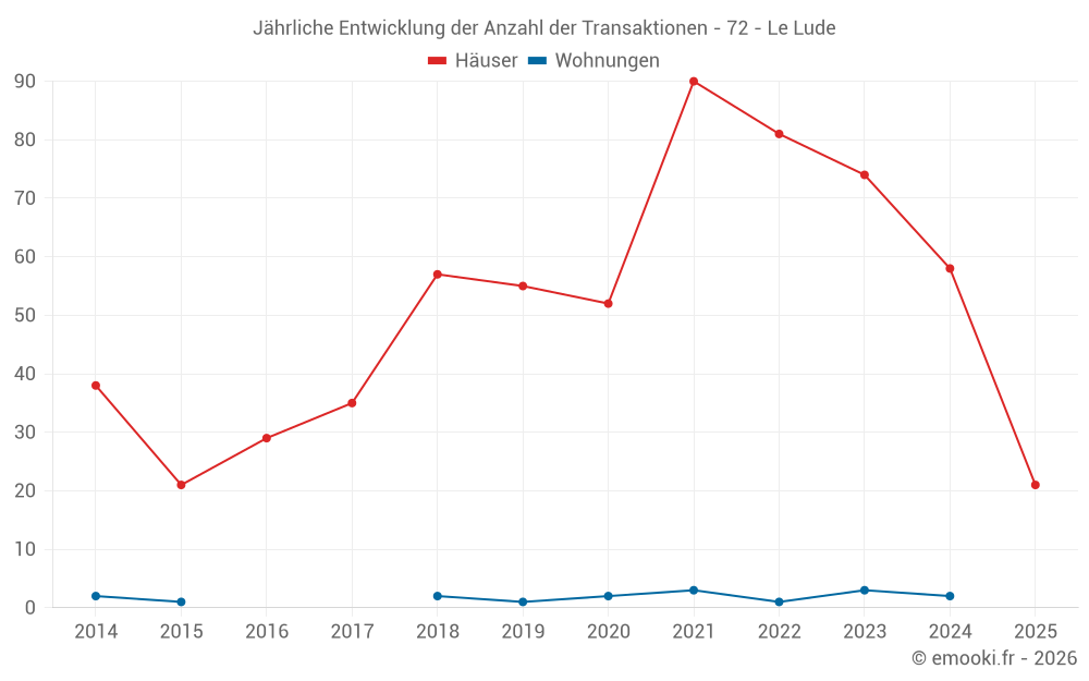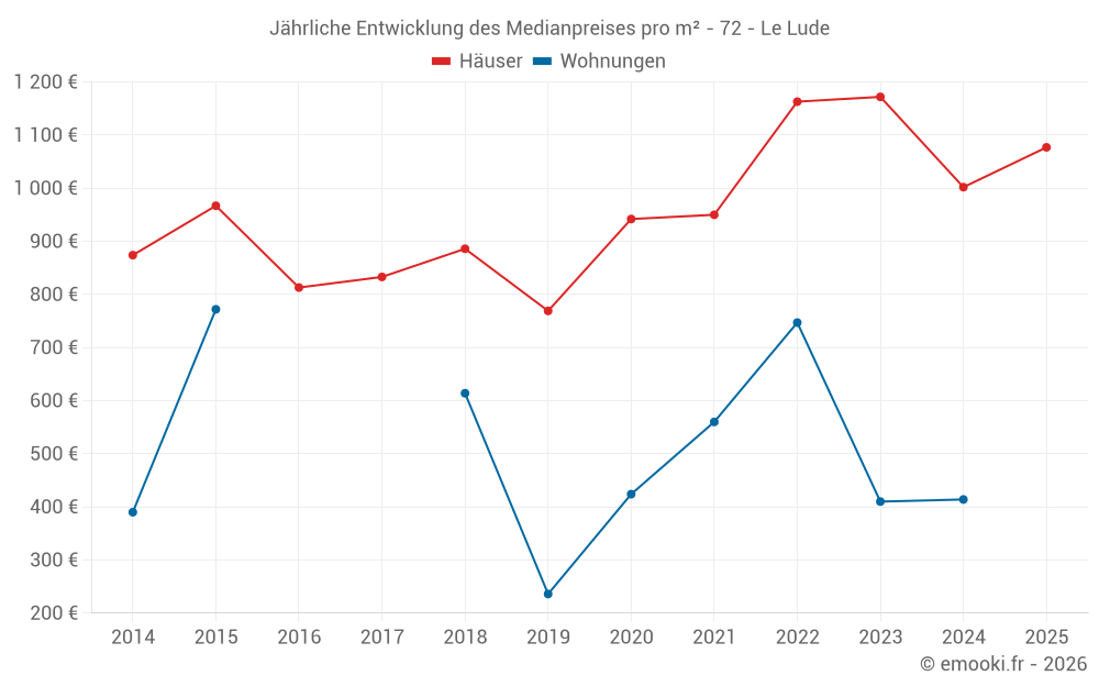 Der Durchschnittspreis auf den 21 Hausgeschäften der letzten 6 Monate in der Gemeinde Le Lude betrug 1 077 € pro Quadratmeter für einen mittleren Immobilienwert von 87 000 €. Über diesen Zeitraum hinweg lagen 60% der Transaktionen zwischen 667 und 1 286 € pro Quadratmeter (vom 2. bis zum 8. Dezil).