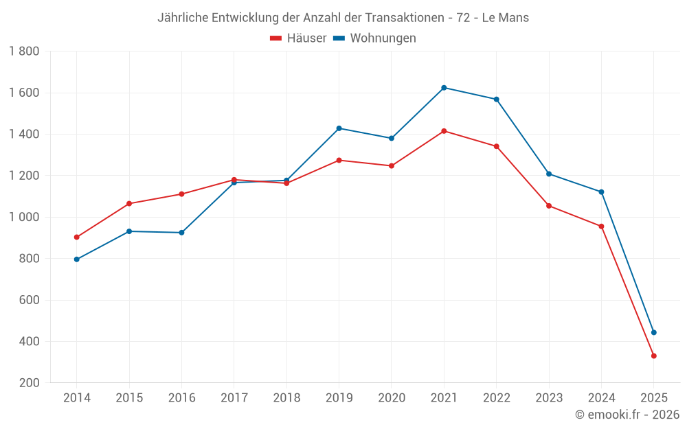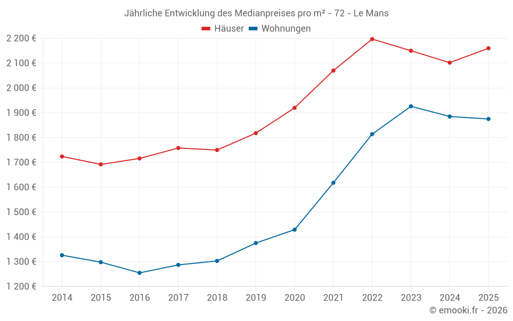 Der Durchschnittspreis auf den 110 Hausgeschäften der letzten 3 Monate in der Gemeinde Le Mans betrug 2 248 € pro Quadratmeter für einen mittleren Immobilienwert von 175 000 €. Über diesen Zeitraum hinweg lagen 60% der Transaktionen zwischen 1 649 und 2 706 € pro Quadratmeter (vom 2. bis zum 8. Dezil).