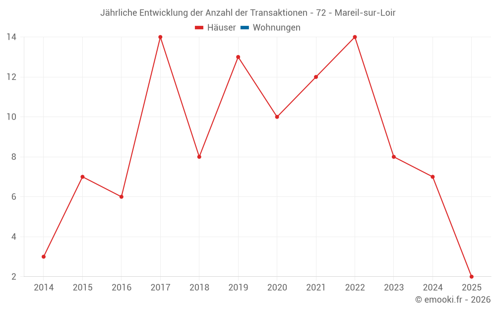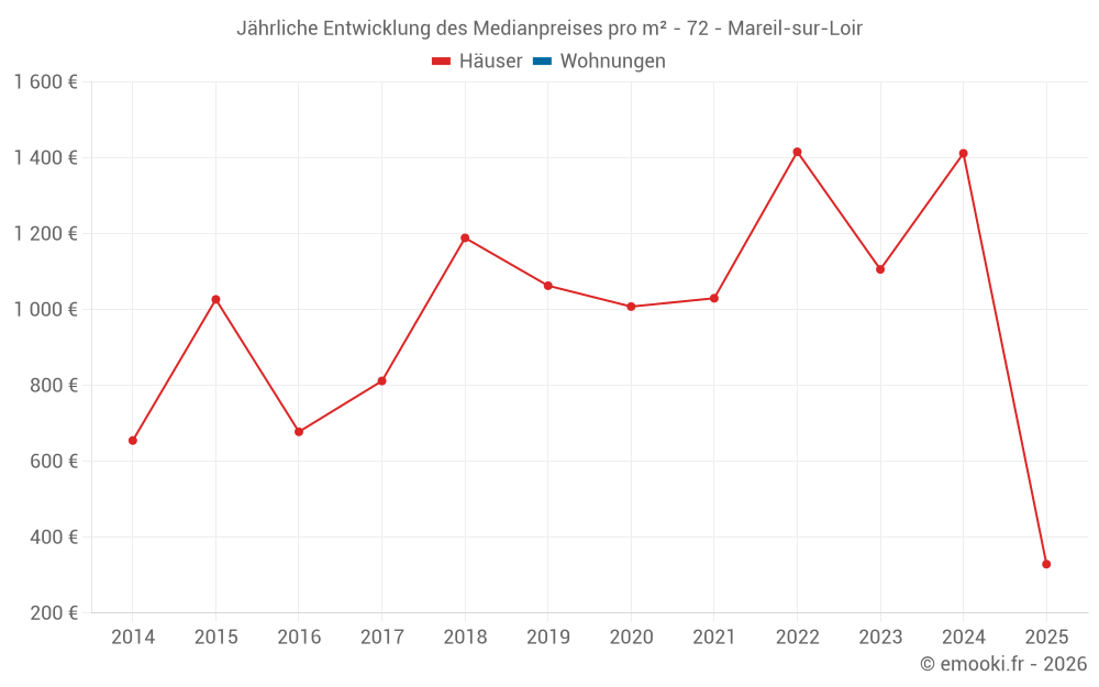 Der Durchschnittspreis auf den 15 Hausgeschäften der letzten 24 Monate in der Gemeinde Mareil-sur-Loir betrug 1 306 € pro Quadratmeter für einen mittleren Immobilienwert von 97 000 €. Über diesen Zeitraum hinweg lagen 60% der Transaktionen zwischen 623 und 1 728 € pro Quadratmeter (vom 2. bis zum 8. Dezil).