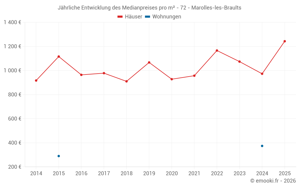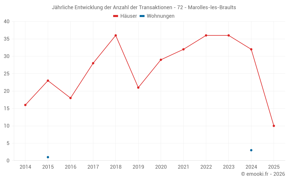 Der Durchschnittspreis auf den 32 Hausgeschäften der letzten 12 Monate in der Gemeinde Marolles-les-Braults betrug 1 052 € pro Quadratmeter für einen mittleren Immobilienwert von 93 100 €. Über diesen Zeitraum hinweg lagen 60% der Transaktionen zwischen 600 und 1 626 € pro Quadratmeter (vom 2. bis zum 8. Dezil).
