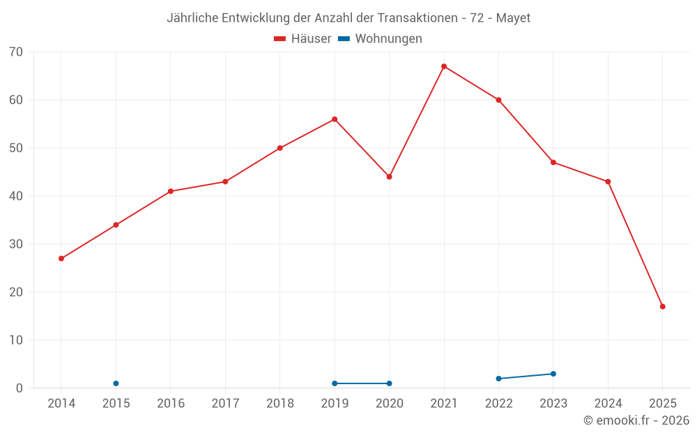 Der Durchschnittspreis auf den 42 Hausgeschäften der letzten 12 Monate in der Gemeinde Mayet betrug 1 187 € pro Quadratmeter für einen mittleren Immobilienwert von 114 500 €. Über diesen Zeitraum hinweg lagen 60% der Transaktionen zwischen 912 und 1 722 € pro Quadratmeter (vom 2. bis zum 8. Dezil).