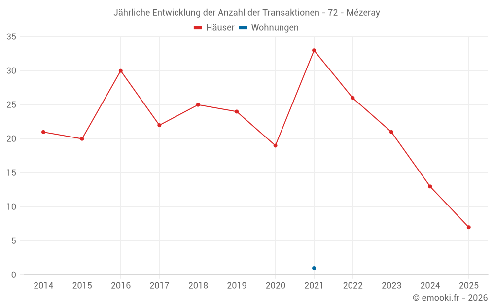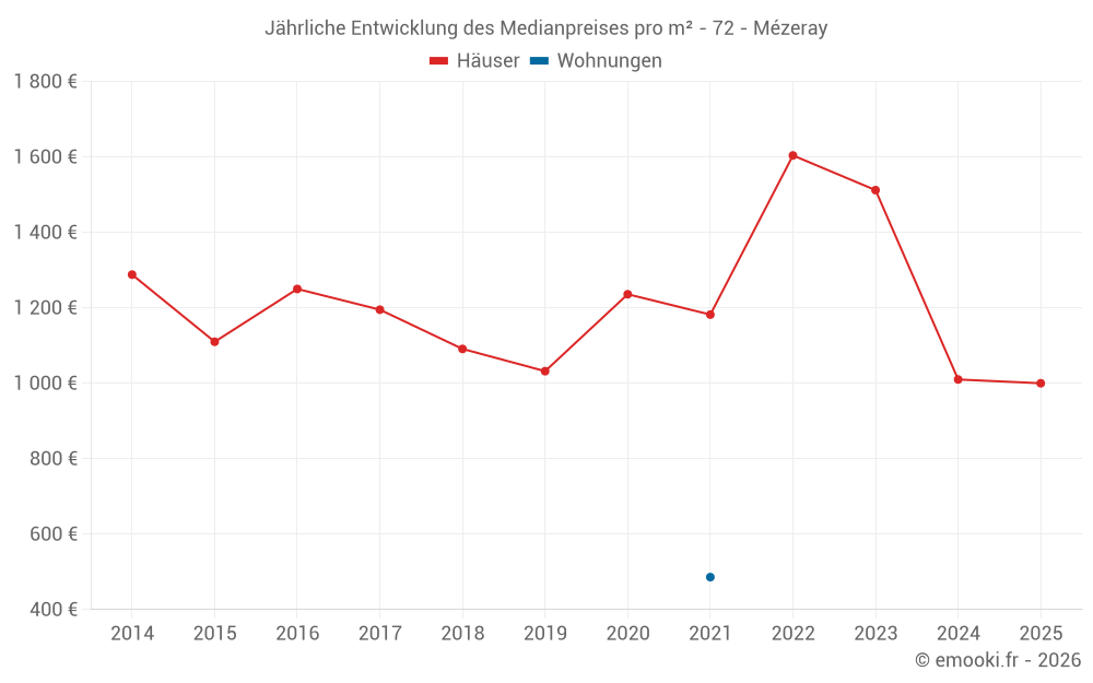 Der Durchschnittspreis auf den 29 Hausgeschäften der letzten 24 Monate in der Gemeinde Mézeray betrug 1 313 € pro Quadratmeter für einen mittleren Immobilienwert von 120 000 €. Über diesen Zeitraum hinweg lagen 60% der Transaktionen zwischen 759 und 1 732 € pro Quadratmeter (vom 2. bis zum 8. Dezil).