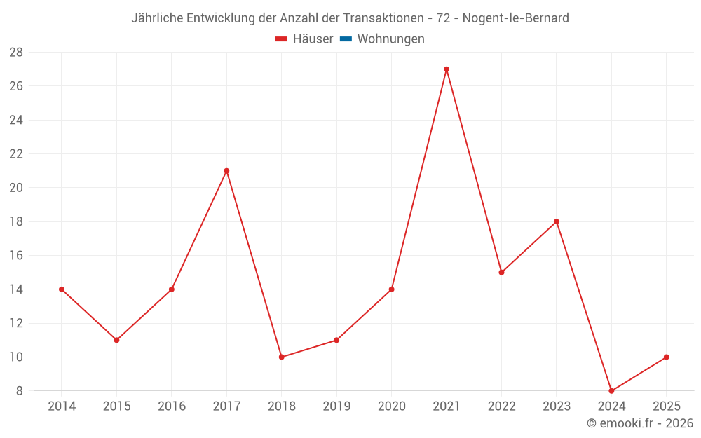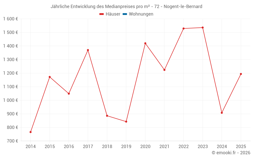 Der Durchschnittspreis auf den 25 Hausgeschäften der letzten 24 Monate in der Gemeinde Nogent-le-Bernard betrug 1 118 € pro Quadratmeter für einen mittleren Immobilienwert von 125 000 €. Über diesen Zeitraum hinweg lagen 60% der Transaktionen zwischen 795 und 1 725 € pro Quadratmeter (vom 2. bis zum 8. Dezil).