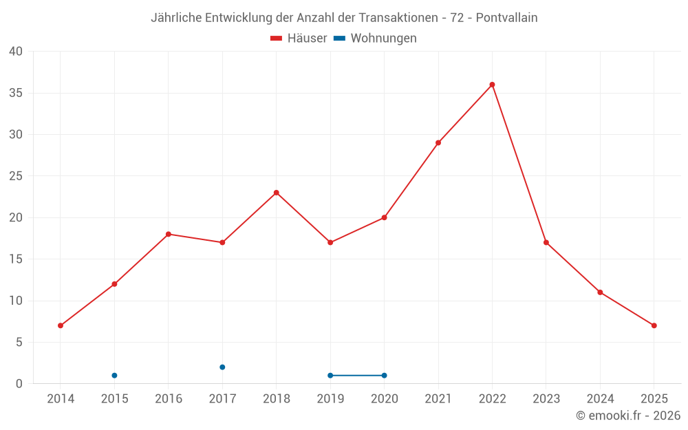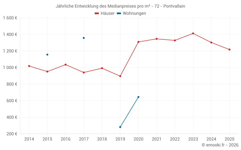 Der Durchschnittspreis auf den 26 Hausgeschäften der letzten 24 Monate in der Gemeinde Pontvallain betrug 1 280 € pro Quadratmeter für einen mittleren Immobilienwert von 121 000 €. Über diesen Zeitraum hinweg lagen 60% der Transaktionen zwischen 1 052 und 1 667 € pro Quadratmeter (vom 2. bis zum 8. Dezil).