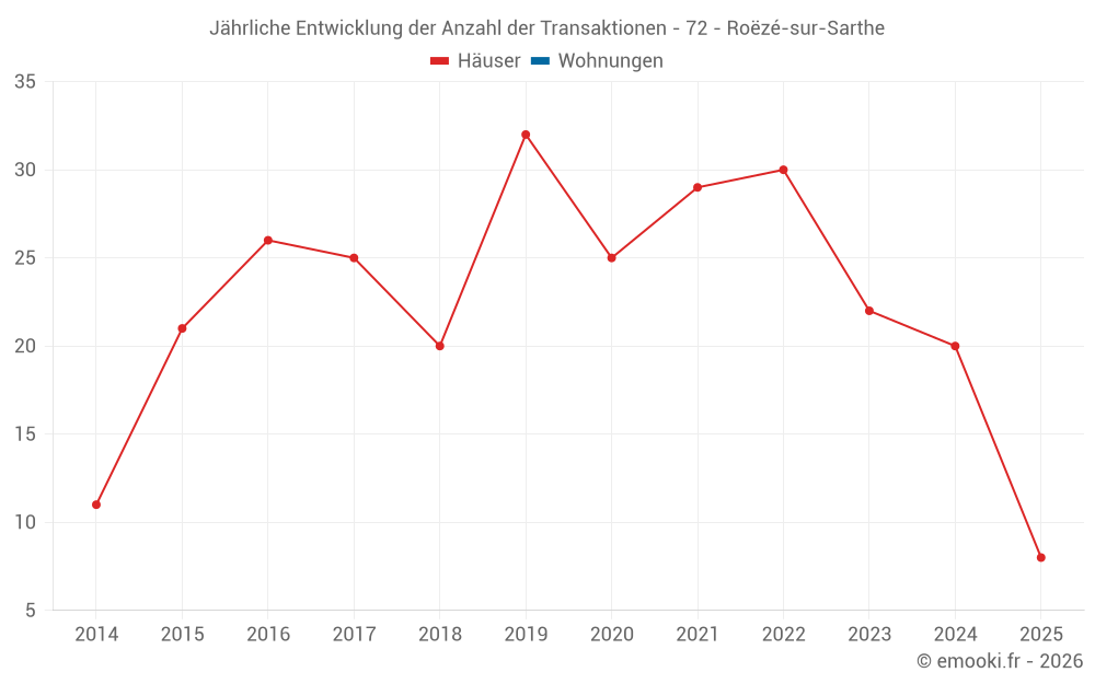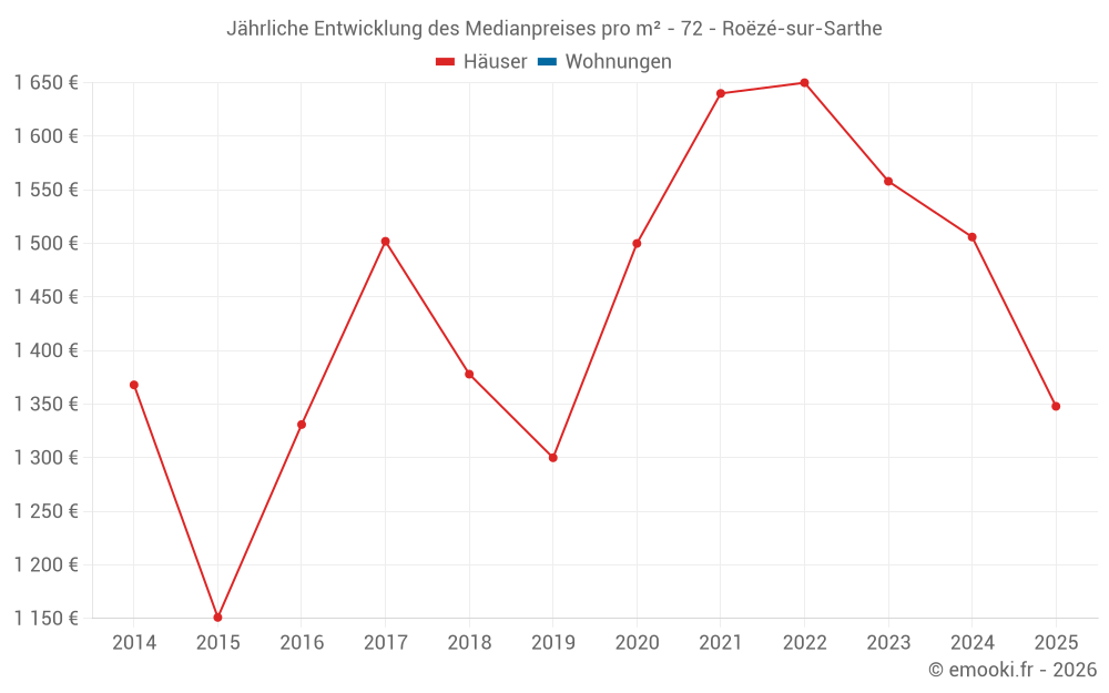 Der Durchschnittspreis auf den 18 Hausgeschäften der letzten 12 Monate in der Gemeinde Roëzé-sur-Sarthe betrug 1 494 € pro Quadratmeter für einen mittleren Immobilienwert von 153 750 €. Über diesen Zeitraum hinweg lagen 60% der Transaktionen zwischen 887 und 1 968 € pro Quadratmeter (vom 2. bis zum 8. Dezil).