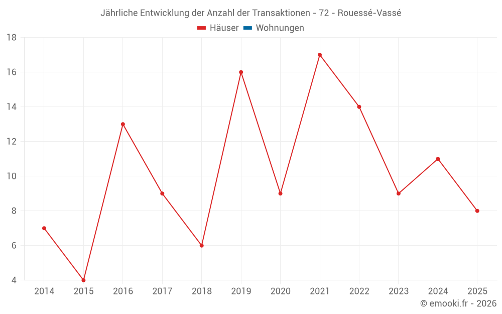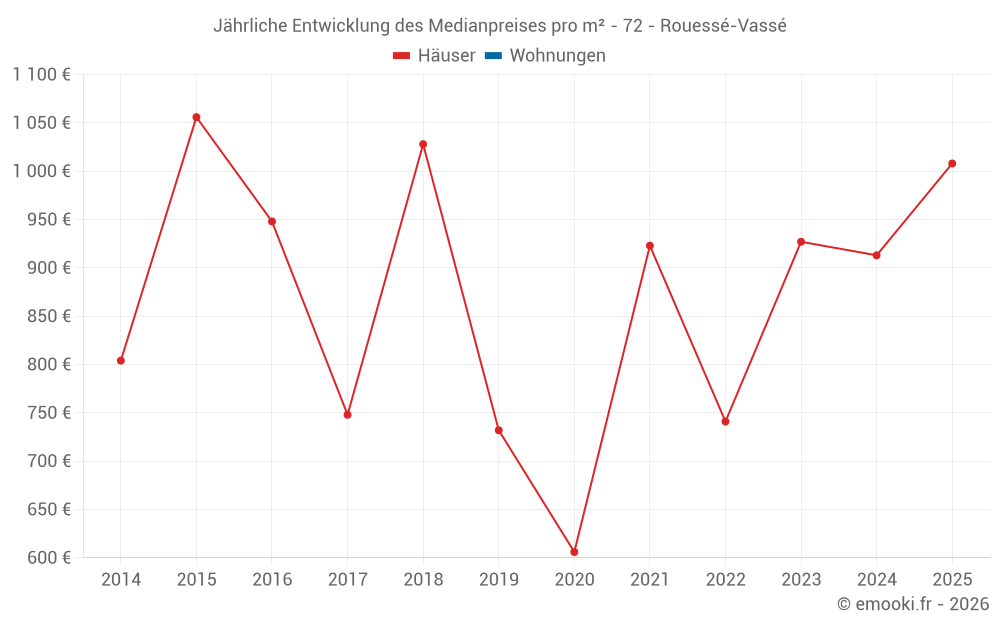 Der Durchschnittspreis auf den 25 Hausgeschäften der letzten 24 Monate in der Gemeinde Rouessé-Vassé betrug 927 € pro Quadratmeter für einen mittleren Immobilienwert von 85 000 €. Über diesen Zeitraum hinweg lagen 60% der Transaktionen zwischen 371 und 1 437 € pro Quadratmeter (vom 2. bis zum 8. Dezil).