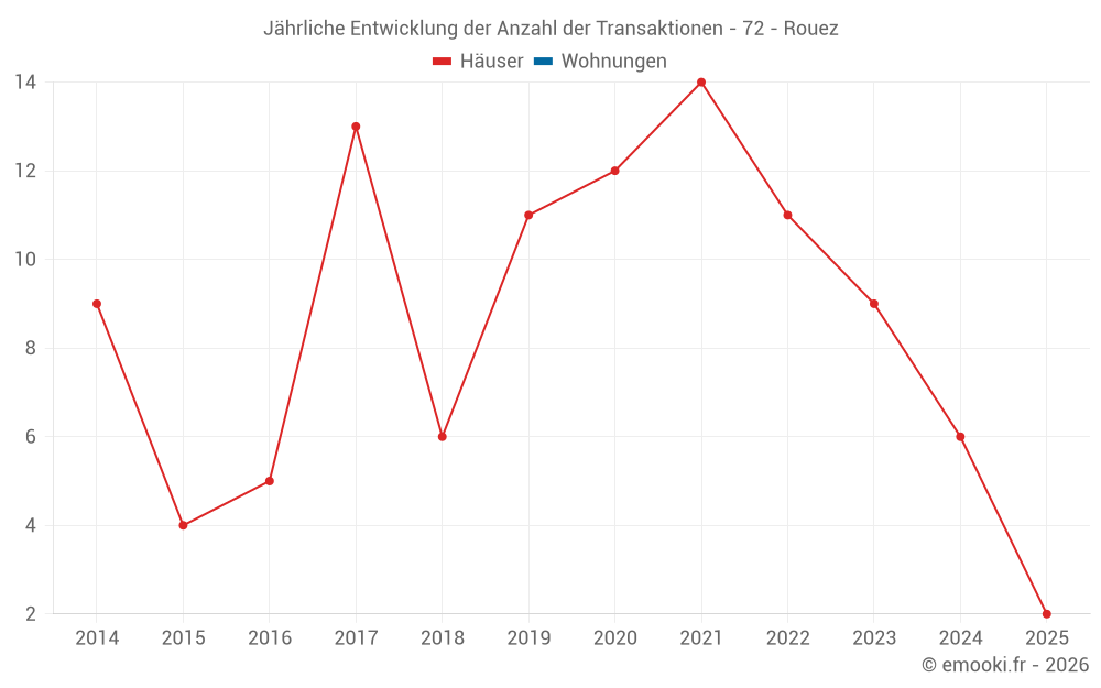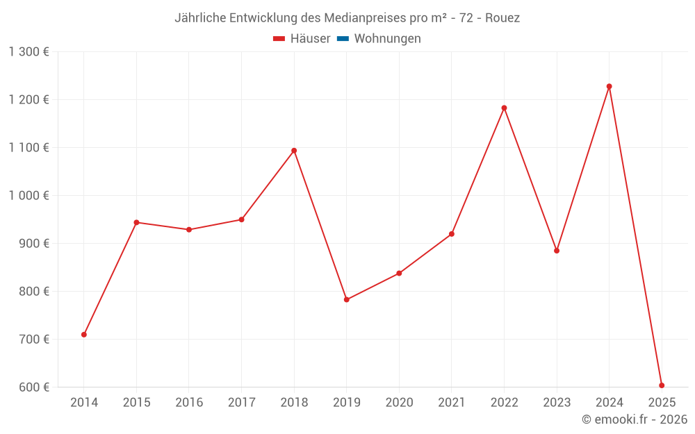 Der Durchschnittspreis auf den 14 Hausgeschäften der letzten 24 Monate in der Gemeinde Rouez betrug 920 € pro Quadratmeter für einen mittleren Immobilienwert von 88 938 €. Über diesen Zeitraum hinweg lagen 60% der Transaktionen zwischen 772 und 1 341 € pro Quadratmeter (vom 2. bis zum 8. Dezil).