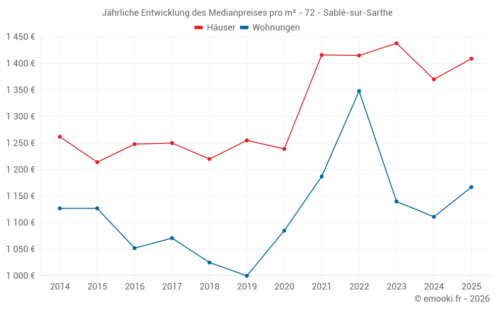 Der Durchschnittspreis auf den 32 Wohnungstransaktionen der letzten 12 Monate in der Gemeinde Sablé-sur-Sarthe betrug 1 152 € pro Quadratmeter für einen mittleren Immobilienwert von 97 500 €. Über diesen Zeitraum hinweg lagen 60% der Transaktionen zwischen 1 025 und 1 545 € pro Quadratmeter (vom 2. bis zum 8. Dezil).
