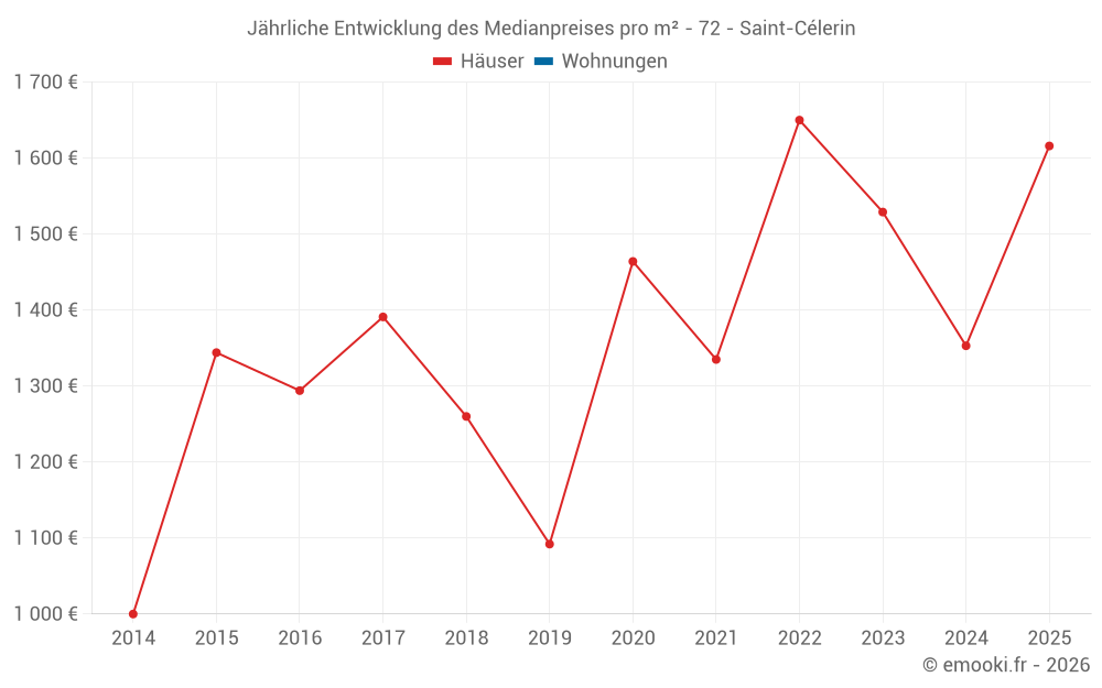 Der Durchschnittspreis auf den 24 Hausgeschäften der letzten 24 Monate in der Gemeinde Saint-Célerin betrug 1 448 € pro Quadratmeter für einen mittleren Immobilienwert von 150 000 €. Über diesen Zeitraum hinweg lagen 60% der Transaktionen zwischen 1 147 und 1 799 € pro Quadratmeter (vom 2. bis zum 8. Dezil).
