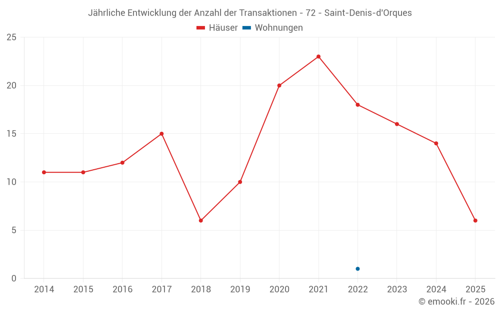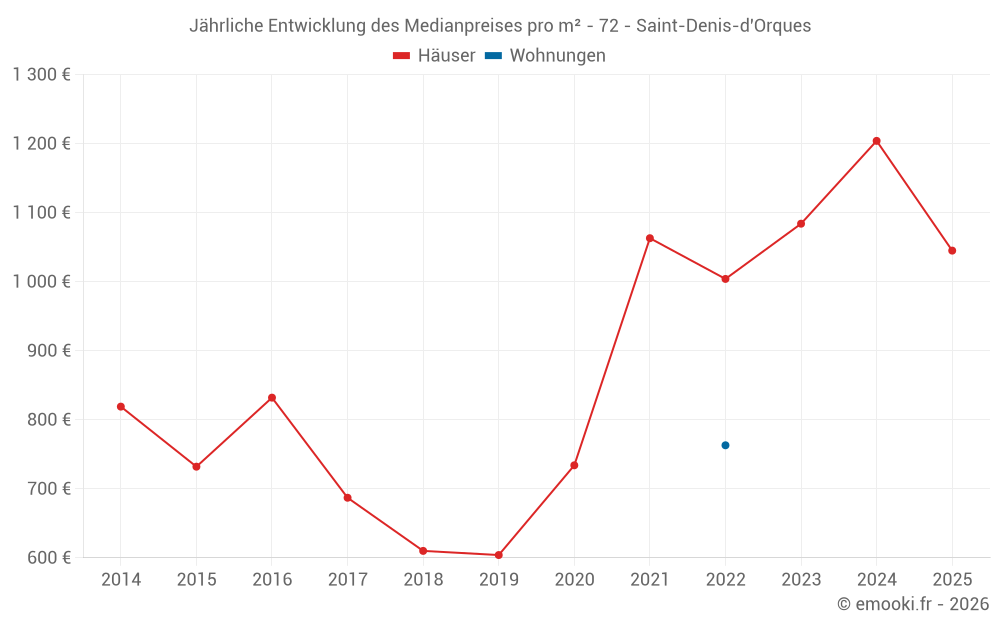 Der Durchschnittspreis auf den 16 Hausgeschäften der letzten 12 Monate in der Gemeinde Saint-Denis-d'Orques betrug 1 229 € pro Quadratmeter für einen mittleren Immobilienwert von 87 500 €. Über diesen Zeitraum hinweg lagen 60% der Transaktionen zwischen 804 und 1 711 € pro Quadratmeter (vom 2. bis zum 8. Dezil).