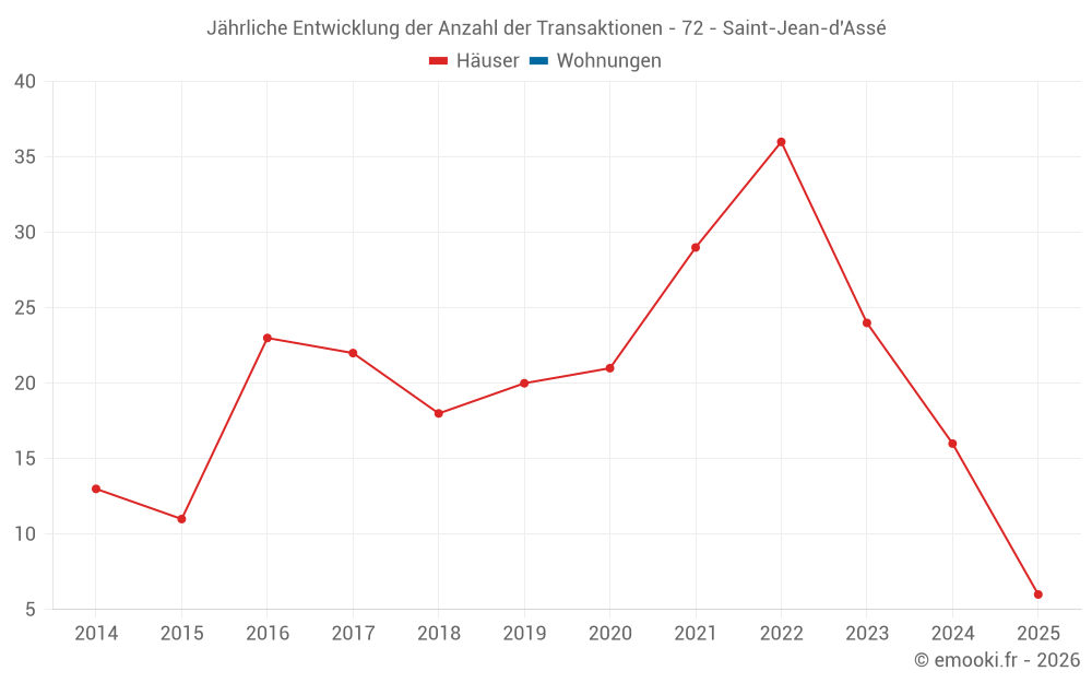 Der Durchschnittspreis auf den 16 Hausgeschäften der letzten 12 Monate in der Gemeinde Saint-Jean-d'Assé betrug 1 720 € pro Quadratmeter für einen mittleren Immobilienwert von 183 500 €. Über diesen Zeitraum hinweg lagen 60% der Transaktionen zwischen 1 517 und 1 952 € pro Quadratmeter (vom 2. bis zum 8. Dezil).