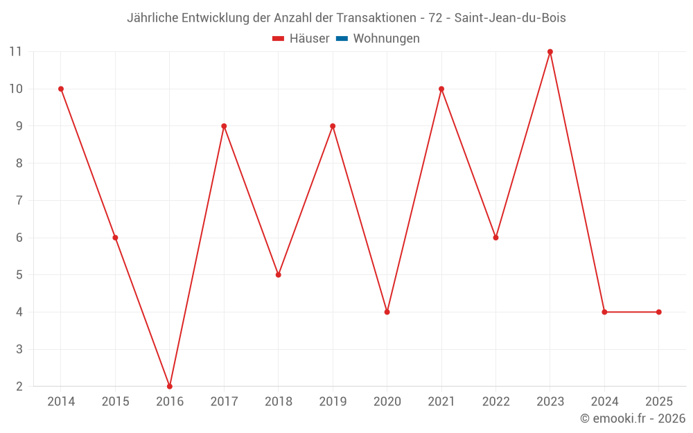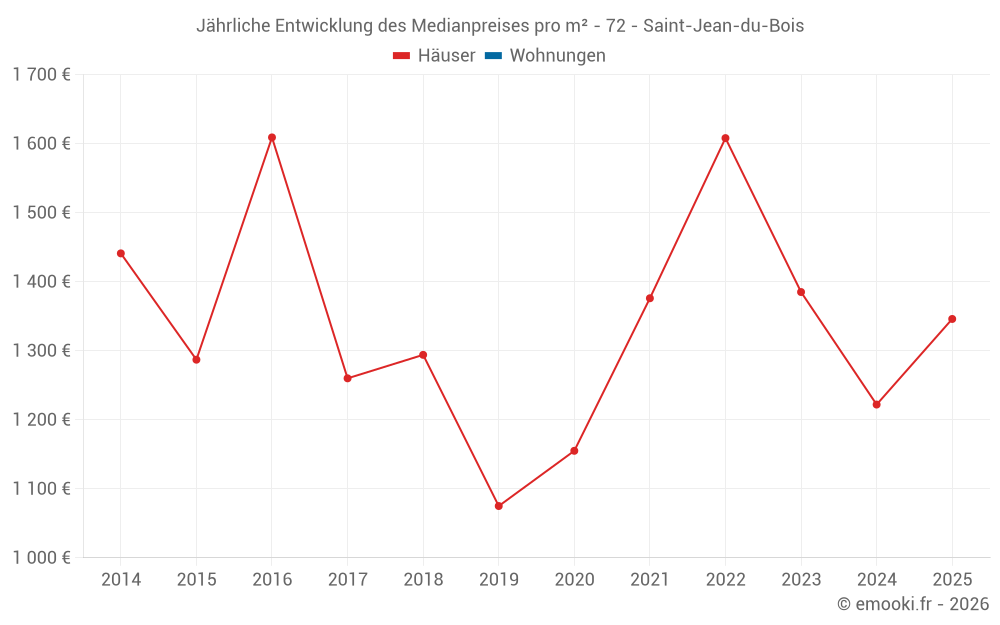 Der Durchschnittspreis auf den 15 Hausgeschäften der letzten 24 Monate in der Gemeinde Saint-Jean-du-Bois betrug 1 429 € pro Quadratmeter für einen mittleren Immobilienwert von 103 400 €. Über diesen Zeitraum hinweg lagen 60% der Transaktionen zwischen 1 044 und 1 723 € pro Quadratmeter (vom 2. bis zum 8. Dezil).