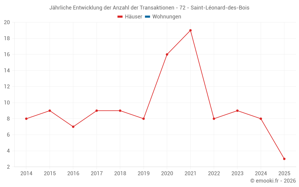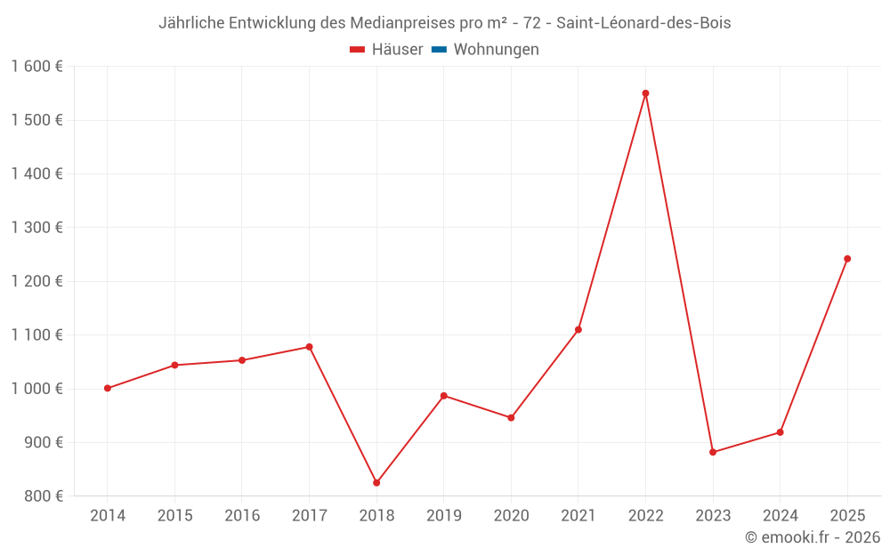 Der Durchschnittspreis auf den 18 Hausgeschäften der letzten 24 Monate in der Gemeinde Saint-Léonard-des-Bois betrug 903 € pro Quadratmeter für einen mittleren Immobilienwert von 71 000 €. Über diesen Zeitraum hinweg lagen 60% der Transaktionen zwischen 550 und 1 542 € pro Quadratmeter (vom 2. bis zum 8. Dezil).