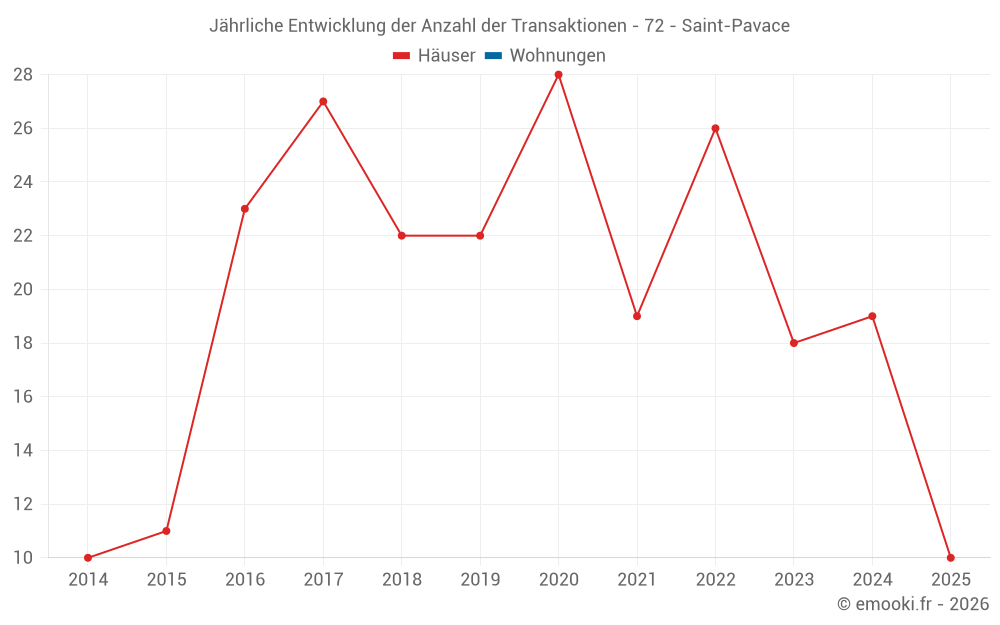 Der Durchschnittspreis auf den 17 Hausgeschäften der letzten 12 Monate in der Gemeinde Saint-Pavace betrug 2 164 € pro Quadratmeter für einen mittleren Immobilienwert von 265 000 €. Über diesen Zeitraum hinweg lagen 60% der Transaktionen zwischen 1 745 und 2 461 € pro Quadratmeter (vom 2. bis zum 8. Dezil).