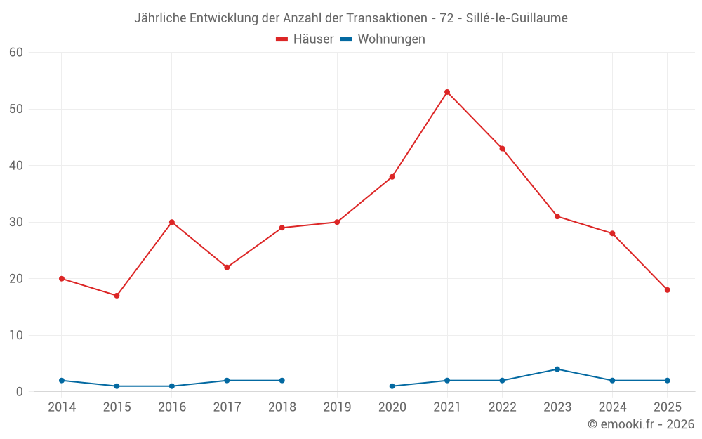 Der Durchschnittspreis auf den 18 Hausgeschäften der letzten 6 Monate in der Gemeinde Sillé-le-Guillaume betrug 992 € pro Quadratmeter für einen mittleren Immobilienwert von 89 500 €. Über diesen Zeitraum hinweg lagen 60% der Transaktionen zwischen 579 und 1 454 € pro Quadratmeter (vom 2. bis zum 8. Dezil).