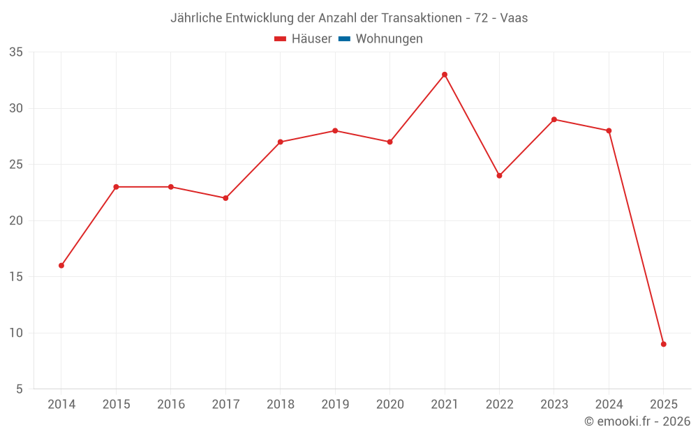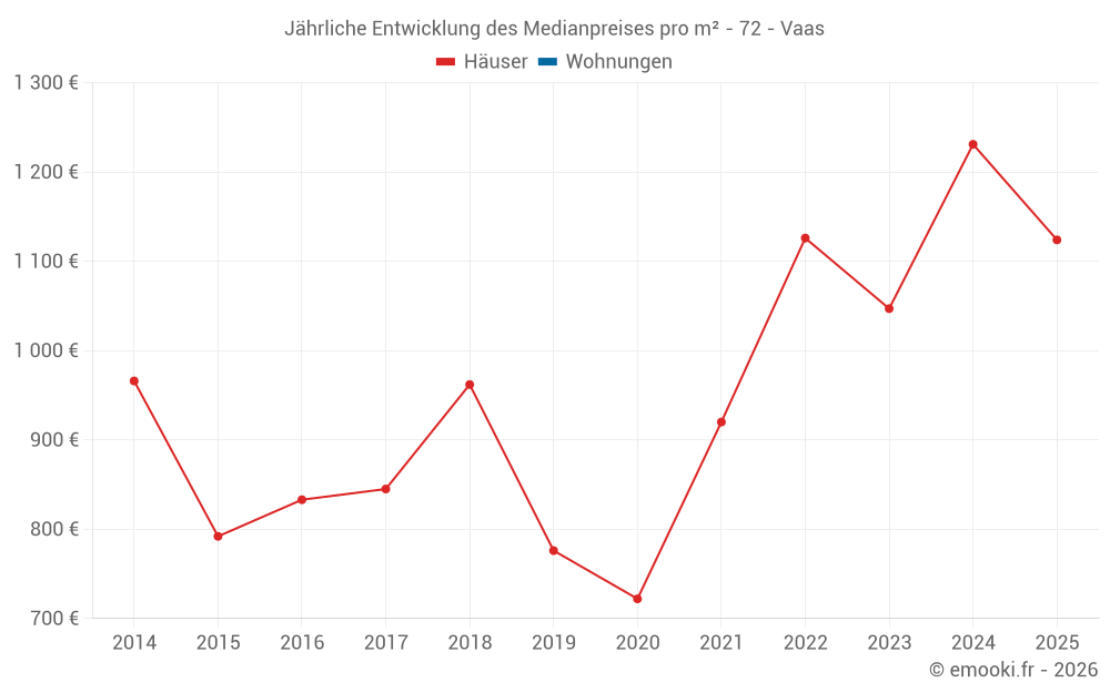 Der Durchschnittspreis auf den 27 Hausgeschäften der letzten 12 Monate in der Gemeinde Vaas betrug 1 204 € pro Quadratmeter für einen mittleren Immobilienwert von 105 000 €. Über diesen Zeitraum hinweg lagen 60% der Transaktionen zwischen 792 und 1 600 € pro Quadratmeter (vom 2. bis zum 8. Dezil).