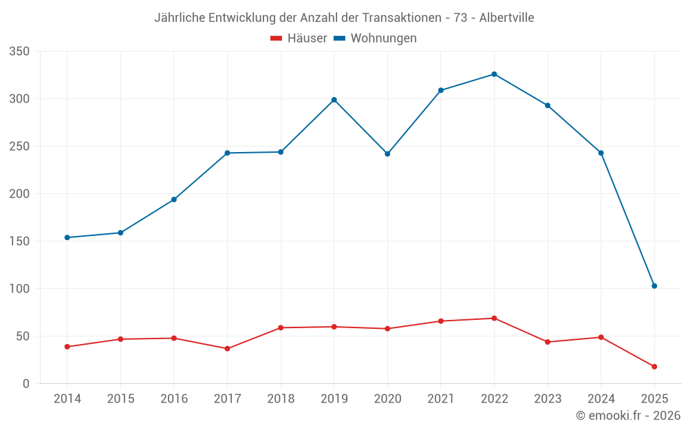 Der Durchschnittspreis auf den 18 Hausgeschäften der letzten 6 Monate in der Gemeinde Albertville betrug 2 736 € pro Quadratmeter für einen mittleren Immobilienwert von 269 000 €. Über diesen Zeitraum hinweg lagen 60% der Transaktionen zwischen 2 056 und 3 244 € pro Quadratmeter (vom 2. bis zum 8. Dezil).