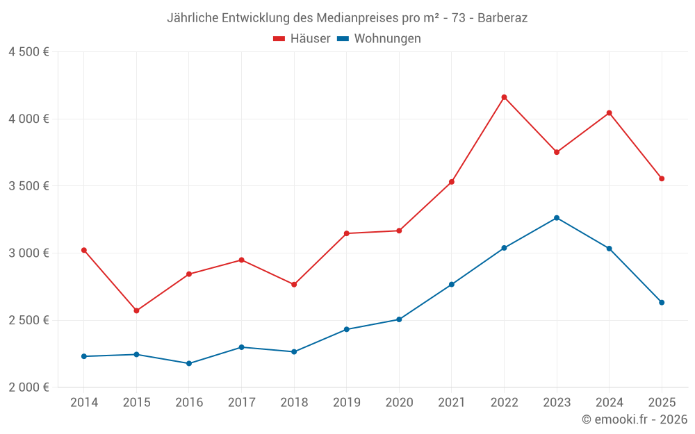 Der Durchschnittspreis auf den 17 Hausgeschäften der letzten 12 Monate in der Gemeinde Barberaz betrug 3 879 € pro Quadratmeter für einen mittleren Immobilienwert von 380 000 €. Über diesen Zeitraum hinweg lagen 60% der Transaktionen zwischen 3 033 und 4 740 € pro Quadratmeter (vom 2. bis zum 8. Dezil).