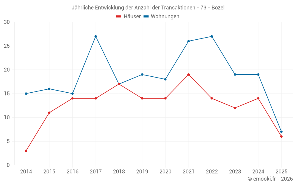 Der Durchschnittspreis auf den 25 Hausgeschäften der letzten 24 Monate in der Gemeinde Bozel betrug 6 176 € pro Quadratmeter für einen mittleren Immobilienwert von 460 000 €. Über diesen Zeitraum hinweg lagen 60% der Transaktionen zwischen 3 634 und 7 884 € pro Quadratmeter (vom 2. bis zum 8. Dezil).