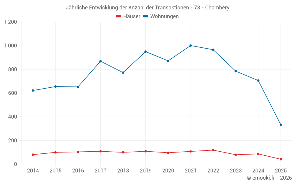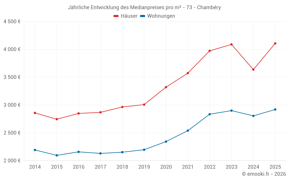 Der Durchschnittspreis auf den 21 Hausgeschäften der letzten 3 Monate in der Gemeinde Chambéry betrug 3 913 € pro Quadratmeter für einen mittleren Immobilienwert von 424 500 €. Über diesen Zeitraum hinweg lagen 60% der Transaktionen zwischen 3 028 und 5 403 € pro Quadratmeter (vom 2. bis zum 8. Dezil).
