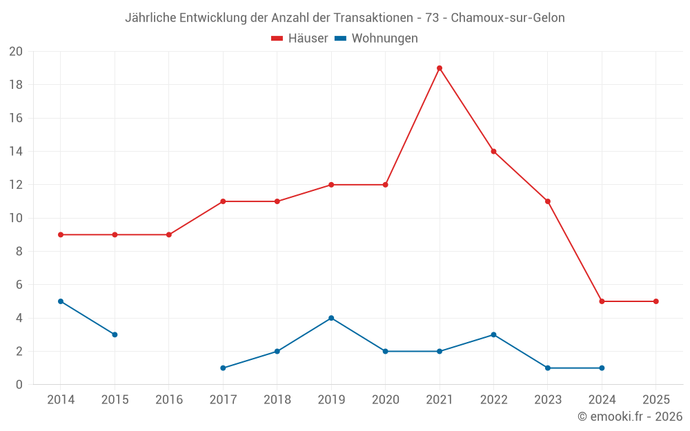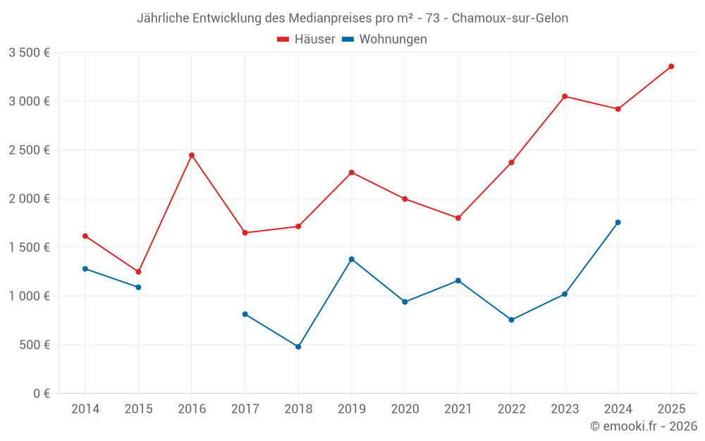 Der Durchschnittspreis auf den 16 Hausgeschäften der letzten 24 Monate in der Gemeinde Chamoux-sur-Gelon betrug 2 924 € pro Quadratmeter für einen mittleren Immobilienwert von 270 000 €. Über diesen Zeitraum hinweg lagen 60% der Transaktionen zwischen 1 958 und 3 407 € pro Quadratmeter (vom 2. bis zum 8. Dezil).
