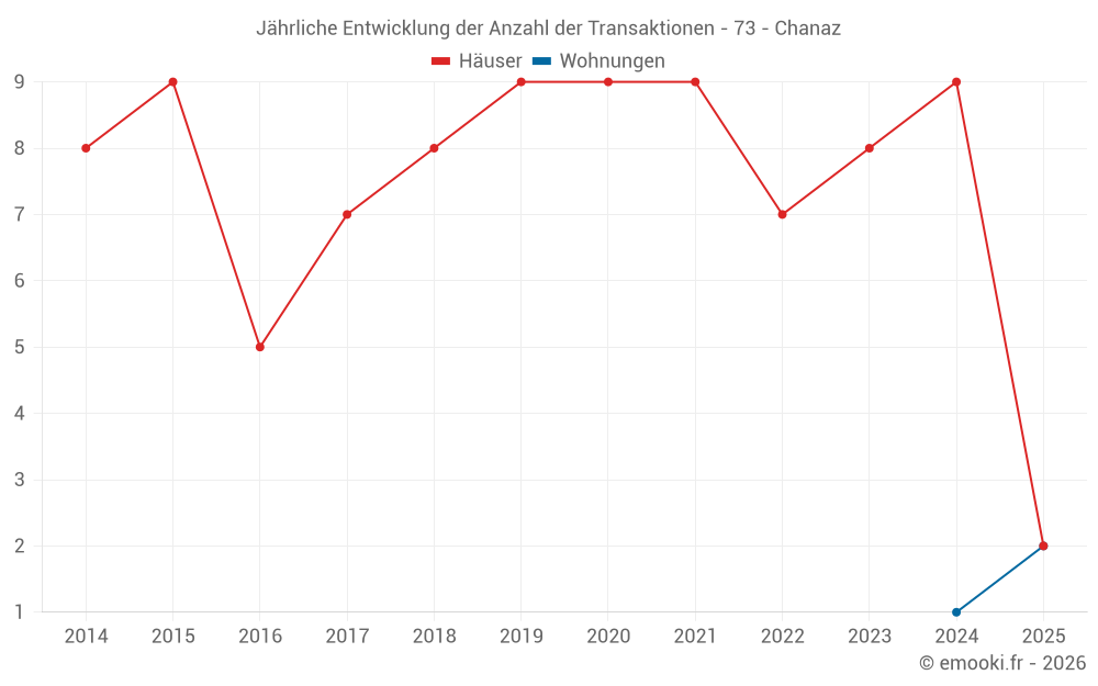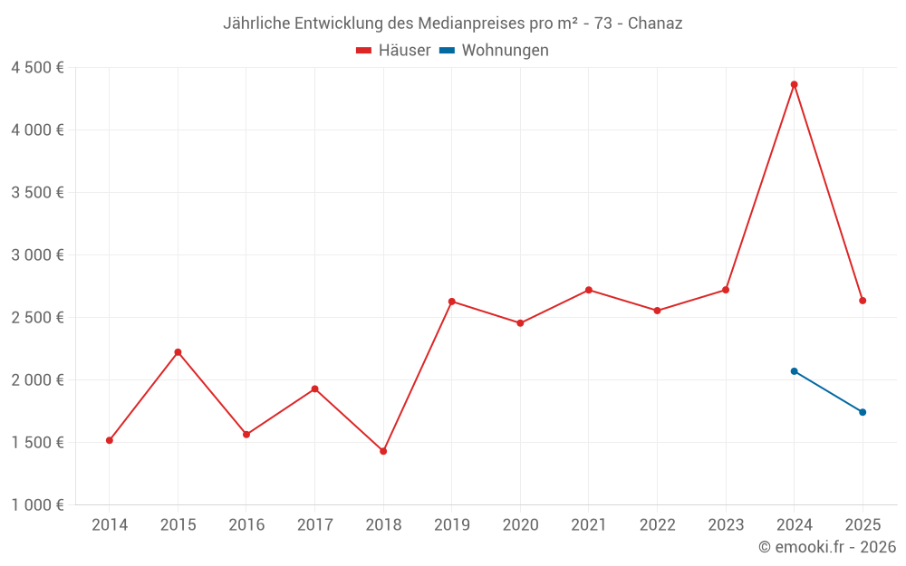 Der Durchschnittspreis auf den 16 Hausgeschäften der letzten 24 Monate in der Gemeinde Chanaz betrug 2 956 € pro Quadratmeter für einen mittleren Immobilienwert von 252 000 €. Über diesen Zeitraum hinweg lagen 60% der Transaktionen zwischen 1 925 und 4 429 € pro Quadratmeter (vom 2. bis zum 8. Dezil).