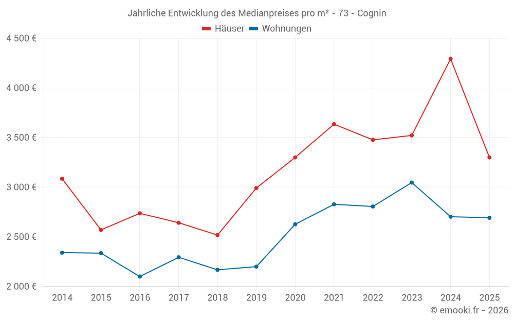 Der Durchschnittspreis auf den 19 Hausgeschäften der letzten 12 Monate in der Gemeinde Cognin betrug 3 508 € pro Quadratmeter für einen mittleren Immobilienwert von 370 000 €. Über diesen Zeitraum hinweg lagen 60% der Transaktionen zwischen 2 872 und 4 639 € pro Quadratmeter (vom 2. bis zum 8. Dezil).