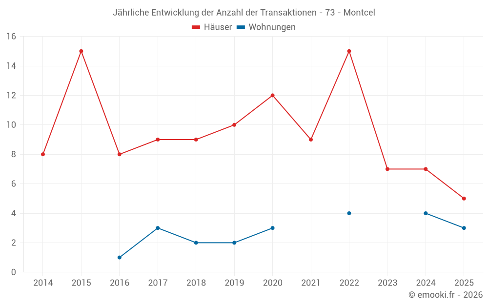 Der Durchschnittspreis auf den 15 Hausgeschäften der letzten 24 Monate in der Gemeinde Montcel betrug 3 930 € pro Quadratmeter für einen mittleren Immobilienwert von 451 100 €. Über diesen Zeitraum hinweg lagen 60% der Transaktionen zwischen 2 518 und 4 676 € pro Quadratmeter (vom 2. bis zum 8. Dezil).