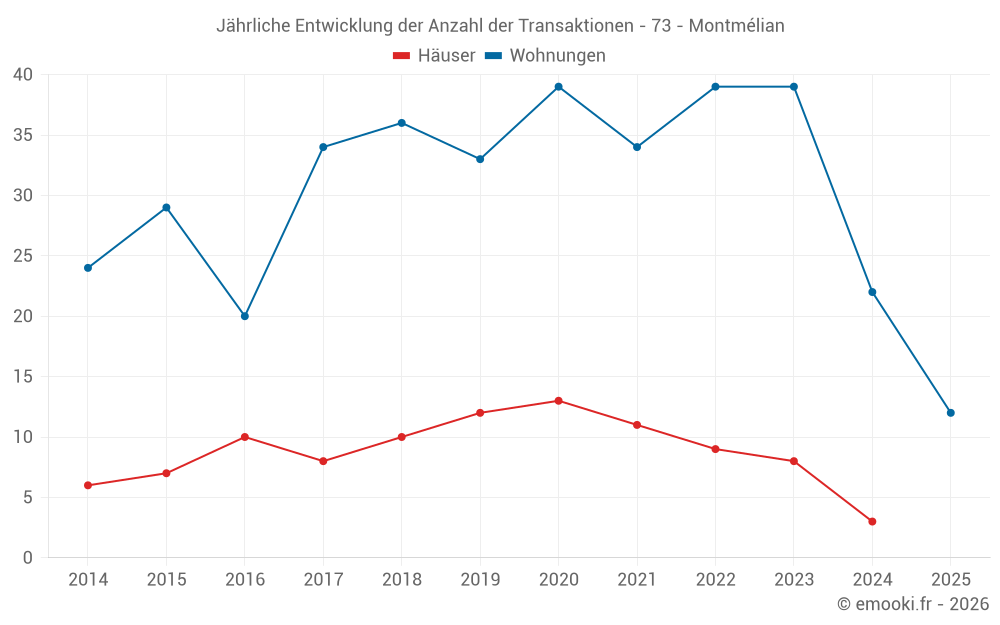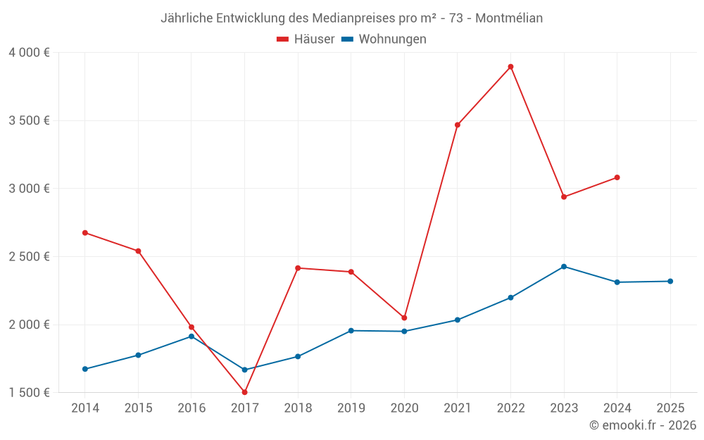 Der Durchschnittspreis auf den 26 Wohnungstransaktionen der letzten 12 Monate in der Gemeinde Montmélian betrug 2 319 € pro Quadratmeter für einen mittleren Immobilienwert von 180 050 €. Über diesen Zeitraum hinweg lagen 60% der Transaktionen zwischen 1 861 und 2 755 € pro Quadratmeter (vom 2. bis zum 8. Dezil).