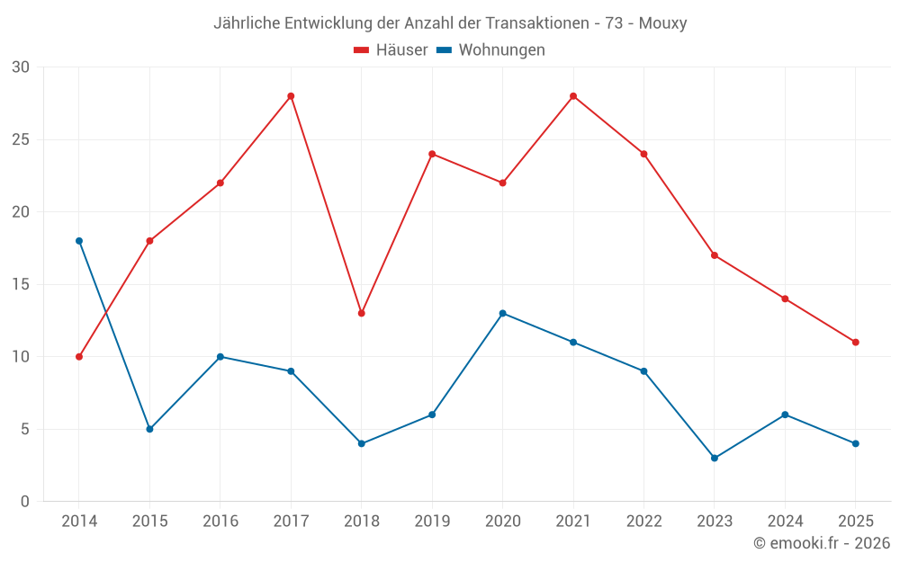 Der Durchschnittspreis auf den 17 Hausgeschäften der letzten 12 Monate in der Gemeinde Mouxy betrug 3 958 € pro Quadratmeter für einen mittleren Immobilienwert von 432 200 €. Über diesen Zeitraum hinweg lagen 60% der Transaktionen zwischen 2 724 und 4 903 € pro Quadratmeter (vom 2. bis zum 8. Dezil).