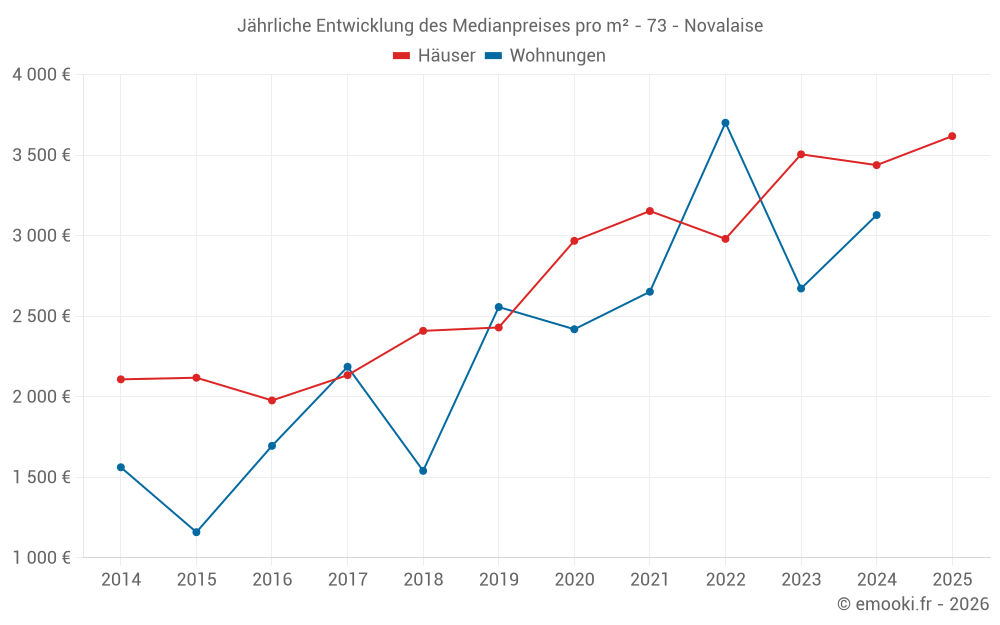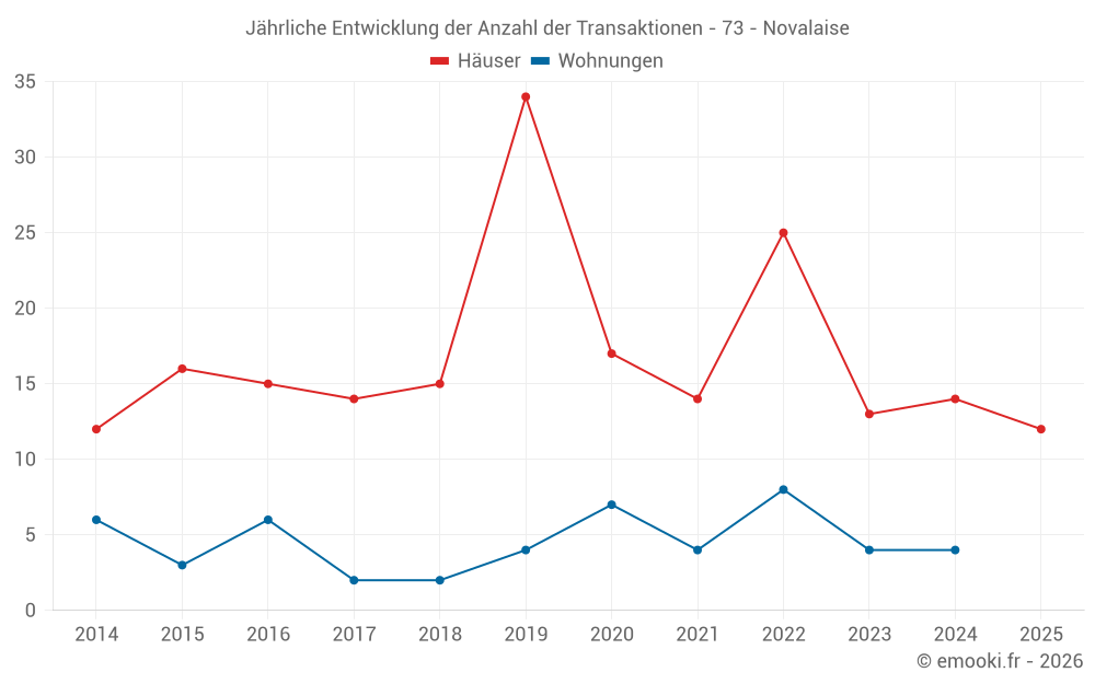 Der Durchschnittspreis auf den 17 Hausgeschäften der letzten 12 Monate in der Gemeinde Novalaise betrug 3 838 € pro Quadratmeter für einen mittleren Immobilienwert von 398 120 €. Über diesen Zeitraum hinweg lagen 60% der Transaktionen zwischen 2 729 und 4 278 € pro Quadratmeter (vom 2. bis zum 8. Dezil).