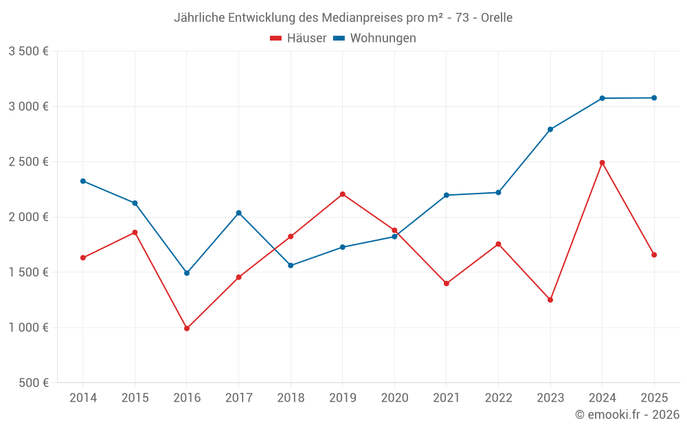 Der Durchschnittspreis auf den 18 Hausgeschäften der letzten 24 Monate in der Gemeinde Orelle betrug 1 877 € pro Quadratmeter für einen mittleren Immobilienwert von 140 000 €. Über diesen Zeitraum hinweg lagen 60% der Transaktionen zwischen 1 040 und 2 958 € pro Quadratmeter (vom 2. bis zum 8. Dezil).