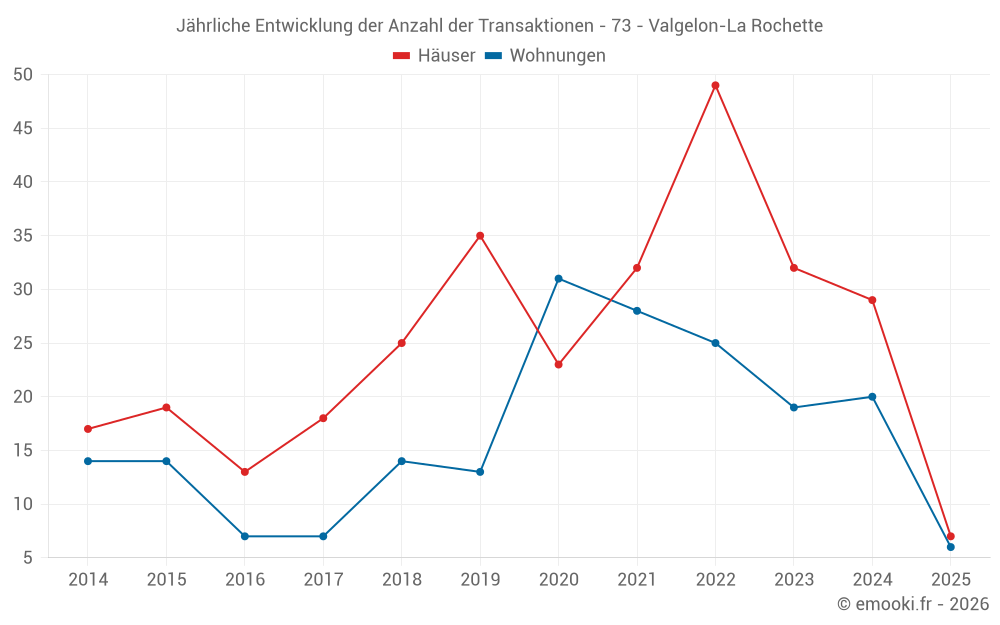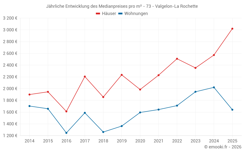 Der Durchschnittspreis auf den 21 Wohnungstransaktionen der letzten 12 Monate in der Gemeinde Valgelon-La Rochette betrug 1 864 € pro Quadratmeter für einen mittleren Immobilienwert von 129 000 €. Über diesen Zeitraum hinweg lagen 60% der Transaktionen zwischen 1 324 und 2 215 € pro Quadratmeter (vom 2. bis zum 8. Dezil).