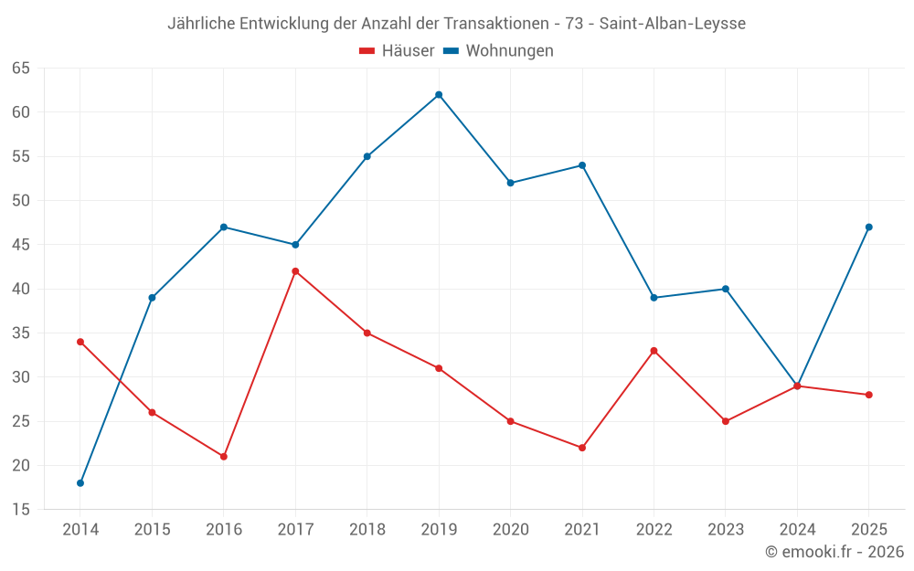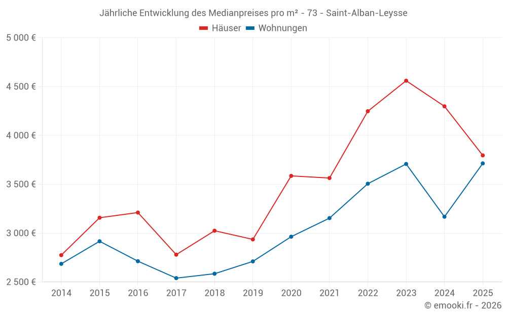 Der Durchschnittspreis auf den 26 Wohnungstransaktionen der letzten 6 Monate in der Gemeinde Saint-Alban-Leysse betrug 3 606 € pro Quadratmeter für einen mittleren Immobilienwert von 234 250 €. Über diesen Zeitraum hinweg lagen 60% der Transaktionen zwischen 3 195 und 3 986 € pro Quadratmeter (vom 2. bis zum 8. Dezil).