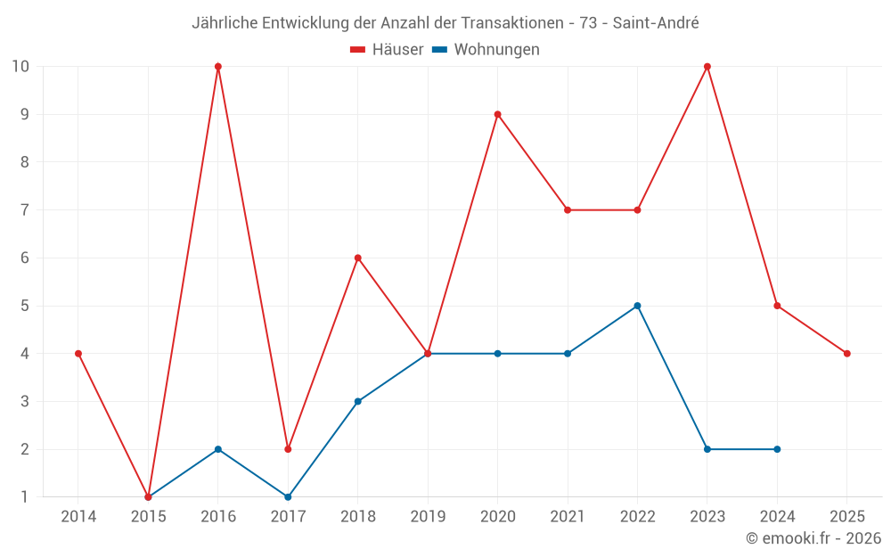 Der Durchschnittspreis auf den 15 Hausgeschäften der letzten 24 Monate in der Gemeinde Saint-André betrug 2 244 € pro Quadratmeter für einen mittleren Immobilienwert von 178 750 €. Über diesen Zeitraum hinweg lagen 60% der Transaktionen zwischen 971 und 2 739 € pro Quadratmeter (vom 2. bis zum 8. Dezil).