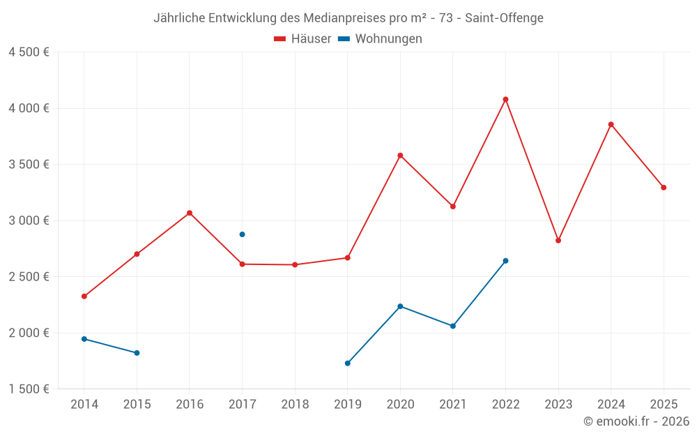 Der Durchschnittspreis auf den 18 Hausgeschäften der letzten 24 Monate in der Gemeinde Saint-Offenge betrug 3 394 € pro Quadratmeter für einen mittleren Immobilienwert von 429 450 €. Über diesen Zeitraum hinweg lagen 60% der Transaktionen zwischen 2 178 und 4 534 € pro Quadratmeter (vom 2. bis zum 8. Dezil).