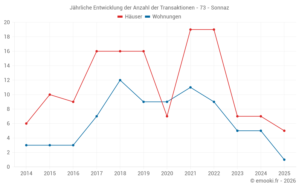 Der Durchschnittspreis auf den 14 Hausgeschäften der letzten 24 Monate in der Gemeinde Sonnaz betrug 4 328 € pro Quadratmeter für einen mittleren Immobilienwert von 440 195 €. Über diesen Zeitraum hinweg lagen 60% der Transaktionen zwischen 3 614 und 4 587 € pro Quadratmeter (vom 2. bis zum 8. Dezil).