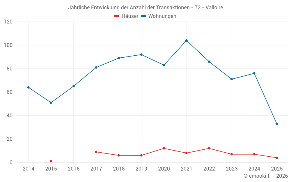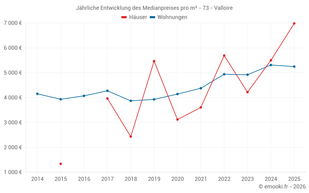 Der Durchschnittspreis auf den 16 Hausgeschäften der letzten 24 Monate in der Gemeinde Valloire betrug 4 860 € pro Quadratmeter für einen mittleren Immobilienwert von 416 000 €. Über diesen Zeitraum hinweg lagen 60% der Transaktionen zwischen 3 267 und 7 787 € pro Quadratmeter (vom 2. bis zum 8. Dezil).