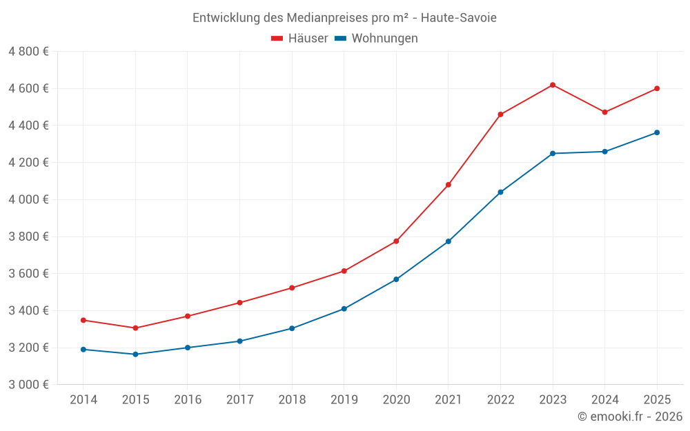 Der Durchschnittspreis auf den 411 Hausgeschäften der letzten 3 Monate im Haute-Savoie-Departement betrug 4 628 € pro Quadratmeter für einen mittleren Immobilienwert von 476 600 €. Über diesen Zeitraum hinweg lagen 60% der Transaktionen zwischen 2 963 und 6 563 € pro Quadratmeter (vom 2. bis zum 8. Dezil).