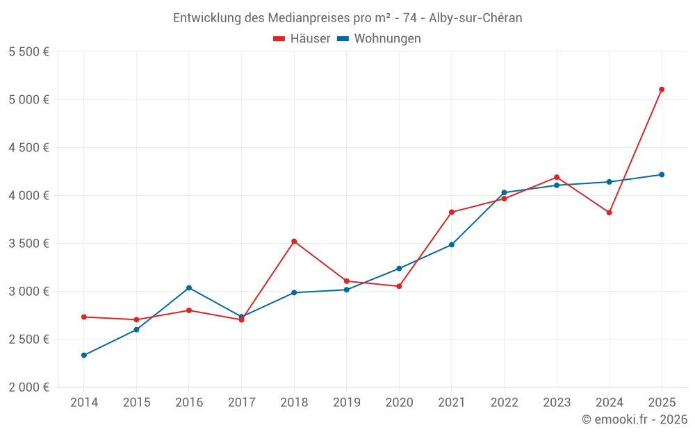 Der Durchschnittspreis auf den 23 Wohnungstransaktionen der letzten 24 Monate in der Gemeinde Alby-sur-Chéran betrug 4 147 € pro Quadratmeter für einen mittleren Immobilienwert von 244 700 €. Über diesen Zeitraum hinweg lagen 60% der Transaktionen zwischen 3 490 und 4 533 € pro Quadratmeter (vom 2. bis zum 8. Dezil).