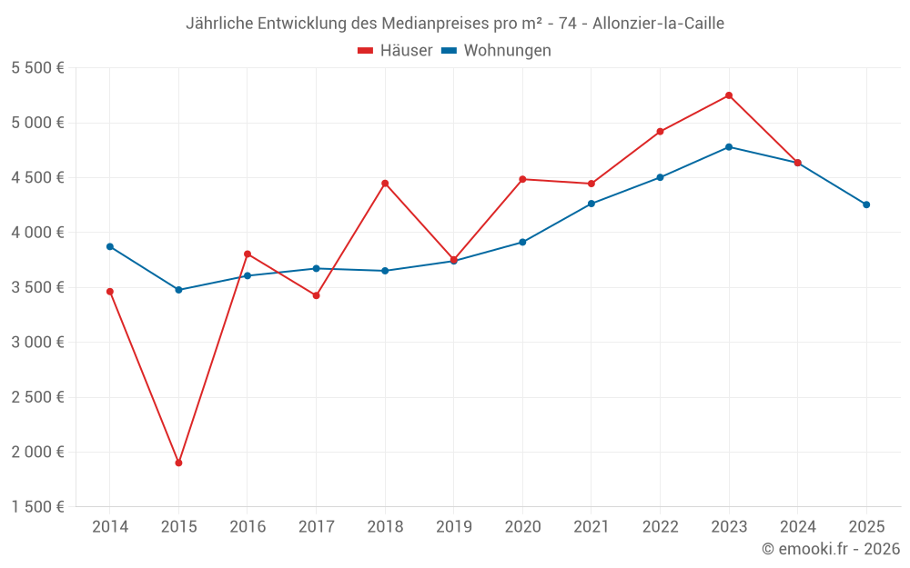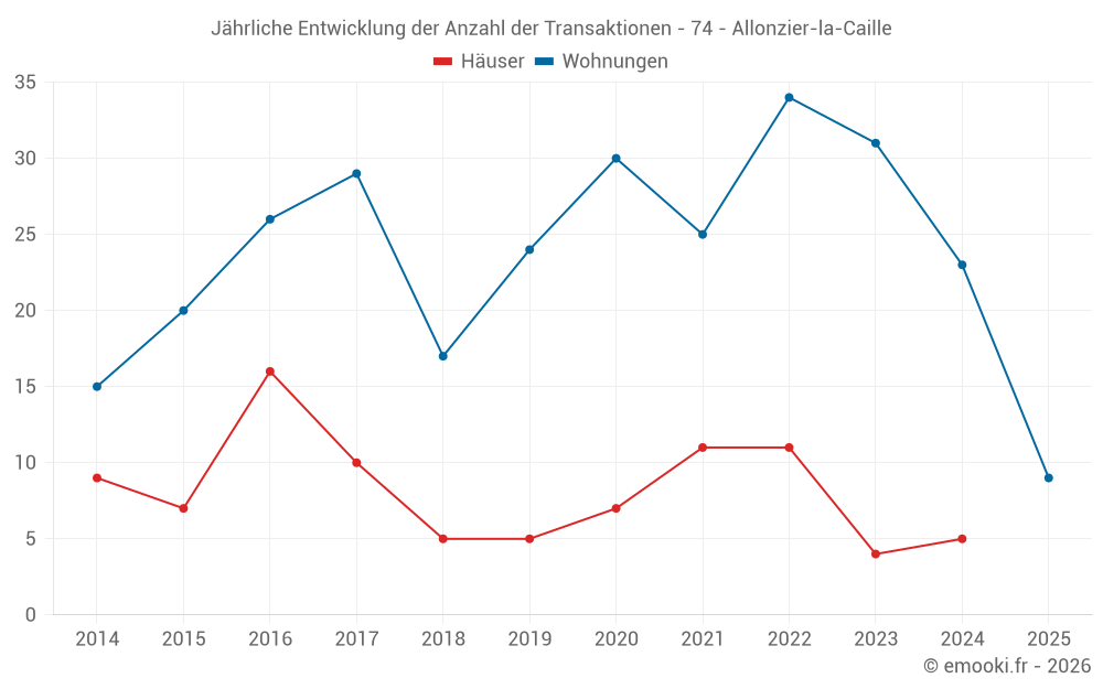 Der Durchschnittspreis auf den 23 Wohnungstransaktionen der letzten 12 Monate in der Gemeinde Allonzier-la-Caille betrug 4 634 € pro Quadratmeter für einen mittleren Immobilienwert von 286 000 €. Über diesen Zeitraum hinweg lagen 60% der Transaktionen zwischen 3 947 und 5 157 € pro Quadratmeter (vom 2. bis zum 8. Dezil).