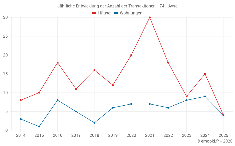 Der Durchschnittspreis auf den 23 Hausgeschäften der letzten 24 Monate in der Gemeinde Ayse betrug 4 217 € pro Quadratmeter für einen mittleren Immobilienwert von 355 000 €. Über diesen Zeitraum hinweg lagen 60% der Transaktionen zwischen 2 859 und 5 489 € pro Quadratmeter (vom 2. bis zum 8. Dezil).