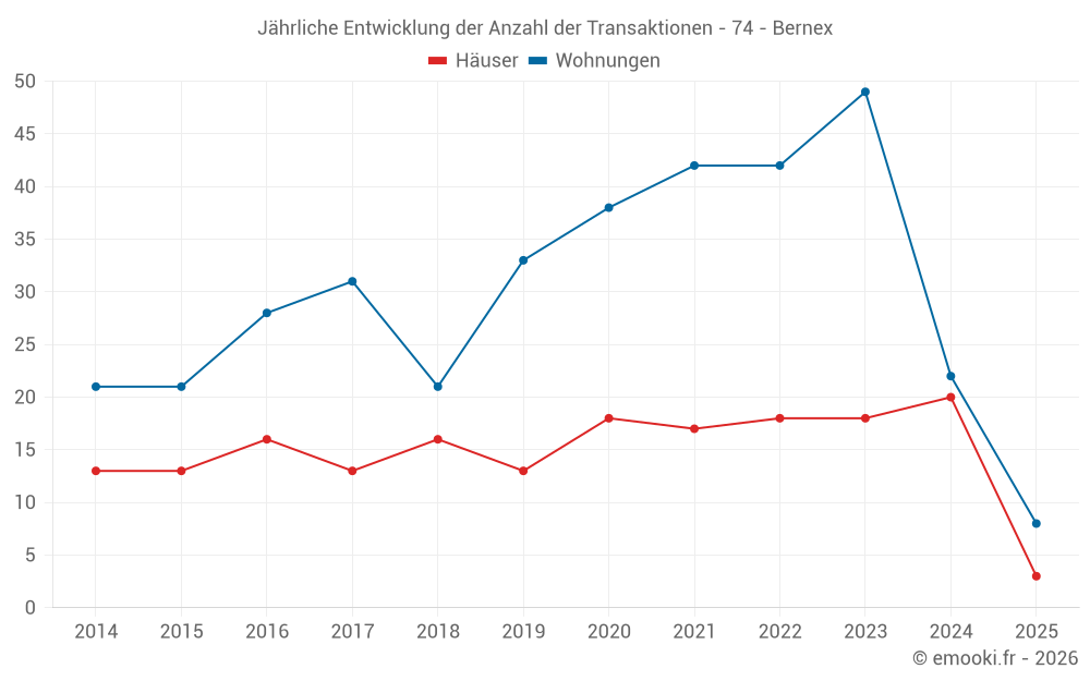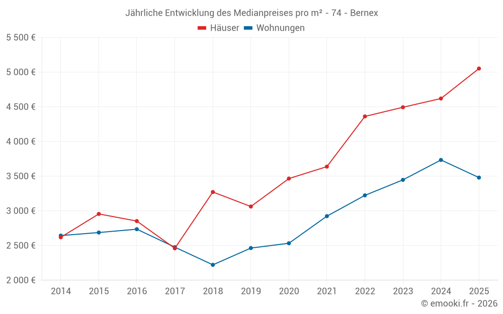 Der Durchschnittspreis auf den 31 Hausgeschäften der letzten 24 Monate in der Gemeinde Bernex betrug 4 608 € pro Quadratmeter für einen mittleren Immobilienwert von 430 000 €. Über diesen Zeitraum hinweg lagen 60% der Transaktionen zwischen 3 487 und 5 429 € pro Quadratmeter (vom 2. bis zum 8. Dezil).