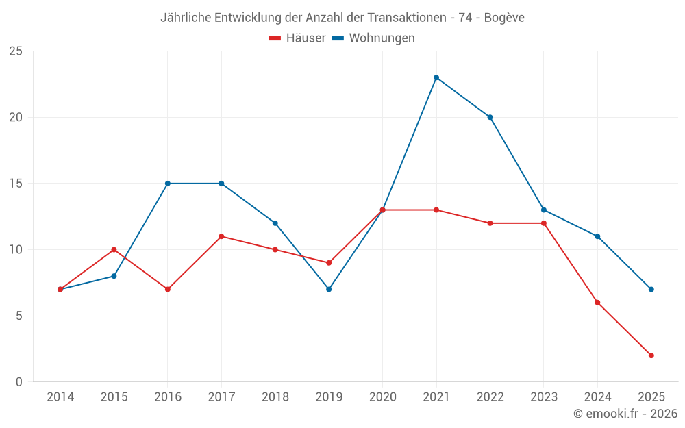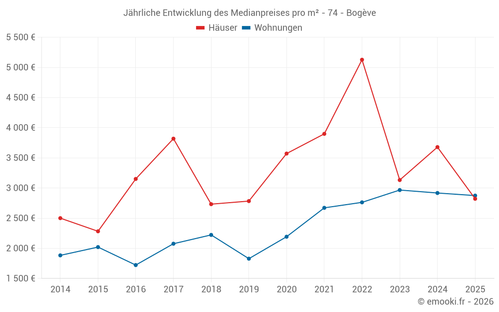 Der Durchschnittspreis auf den 24 Wohnungstransaktionen der letzten 24 Monate in der Gemeinde Bogève betrug 2 860 € pro Quadratmeter für einen mittleren Immobilienwert von 66 618 €. Über diesen Zeitraum hinweg lagen 60% der Transaktionen zwischen 2 156 und 3 266 € pro Quadratmeter (vom 2. bis zum 8. Dezil).