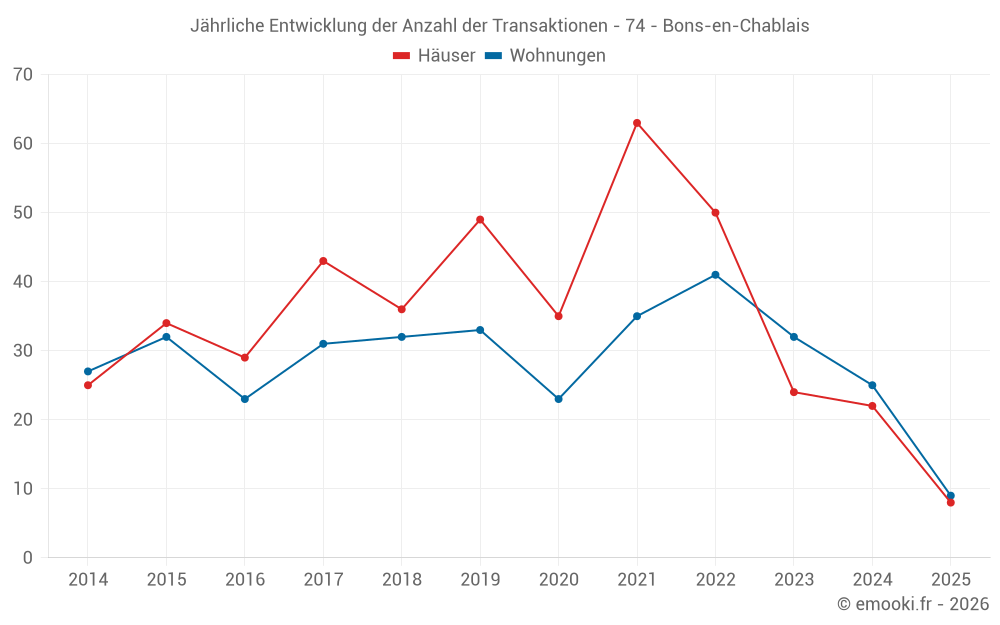 Der Durchschnittspreis auf den 22 Hausgeschäften der letzten 12 Monate in der Gemeinde Bons-en-Chablais betrug 4 452 € pro Quadratmeter für einen mittleren Immobilienwert von 416 750 €. Über diesen Zeitraum hinweg lagen 60% der Transaktionen zwischen 3 123 und 5 077 € pro Quadratmeter (vom 2. bis zum 8. Dezil).