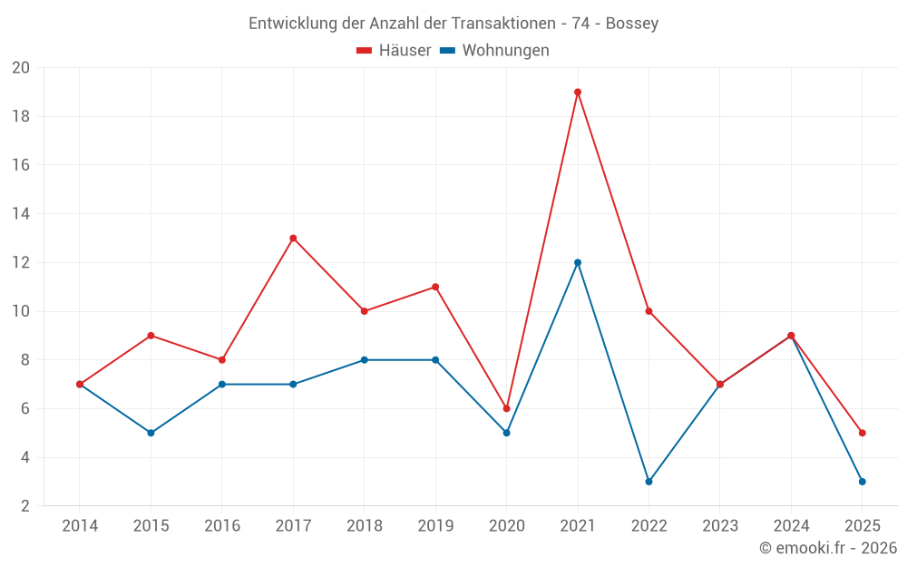 Der Durchschnittspreis auf den 19 Hausgeschäften der letzten 24 Monate in der Gemeinde Bossey betrug 5 530 € pro Quadratmeter für einen mittleren Immobilienwert von 775 000 €. Über diesen Zeitraum hinweg lagen 60% der Transaktionen zwischen 4 141 und 7 223 € pro Quadratmeter (vom 2. bis zum 8. Dezil).