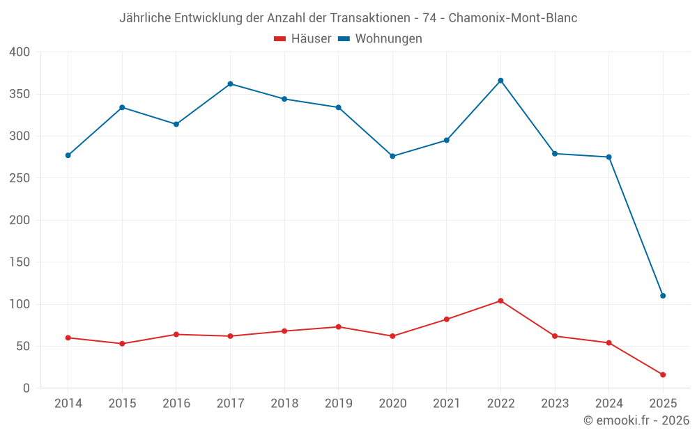 Der Durchschnittspreis auf den 47 Hausgeschäften der letzten 12 Monate in der Gemeinde Chamonix-Mont-Blanc betrug 14 387 € pro Quadratmeter für einen mittleren Immobilienwert von 1 800 000 €. Über diesen Zeitraum hinweg lagen 60% der Transaktionen zwischen 10 085 und 22 152 € pro Quadratmeter (vom 2. bis zum 8. Dezil).