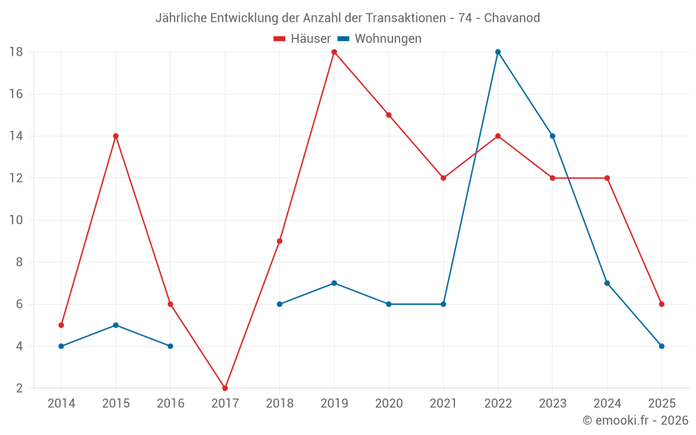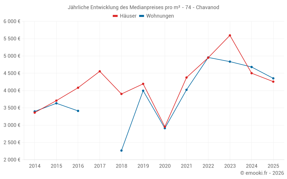 Der Durchschnittspreis auf den 17 Wohnungstransaktionen der letzten 24 Monate in der Gemeinde Chavanod betrug 4 580 € pro Quadratmeter für einen mittleren Immobilienwert von 307 000 €. Über diesen Zeitraum hinweg lagen 60% der Transaktionen zwischen 3 172 und 4 866 € pro Quadratmeter (vom 2. bis zum 8. Dezil).