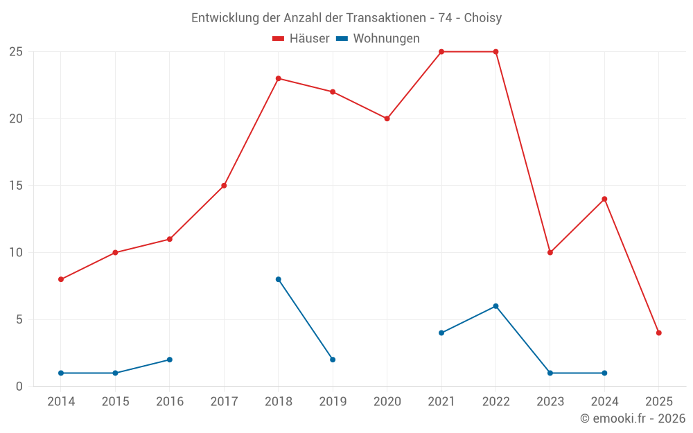 Der Durchschnittspreis auf den 24 Hausgeschäften der letzten 24 Monate in der Gemeinde Choisy betrug 4 826 € pro Quadratmeter für einen mittleren Immobilienwert von 481 500 €. Über diesen Zeitraum hinweg lagen 60% der Transaktionen zwischen 3 463 und 5 479 € pro Quadratmeter (vom 2. bis zum 8. Dezil).