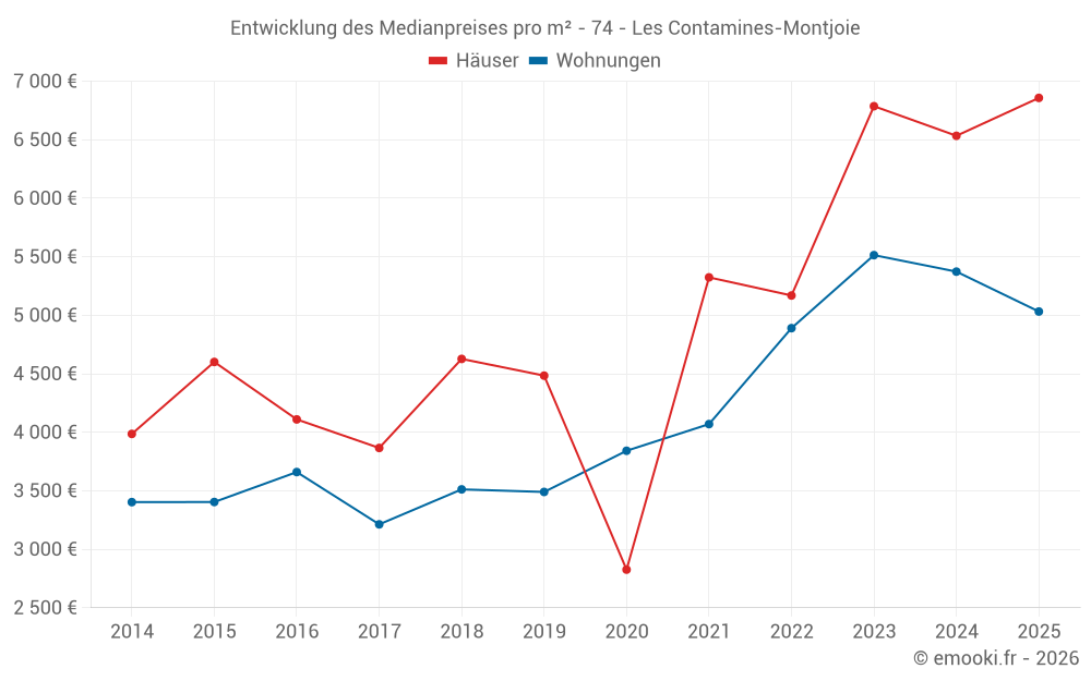 Der Durchschnittspreis auf den 20 Hausgeschäften der letzten 24 Monate in der Gemeinde Les Contamines-Montjoie betrug 6 533 € pro Quadratmeter für einen mittleren Immobilienwert von 785 050 €. Über diesen Zeitraum hinweg lagen 60% der Transaktionen zwischen 3 835 und 8 260 € pro Quadratmeter (vom 2. bis zum 8. Dezil).